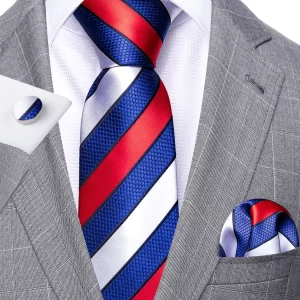 Royal Blue Stripe Silk Tie Set for Men – Necktie, Handkerchief & Cufflinks