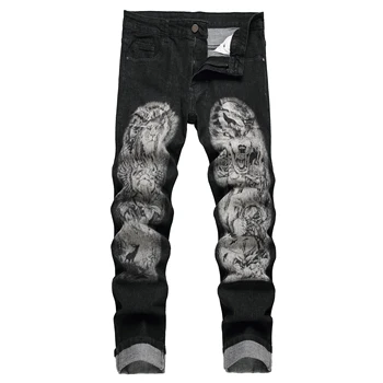 Men's black print pants; Men's print wolf head pattern jeans; Stretch blue jeans 90035