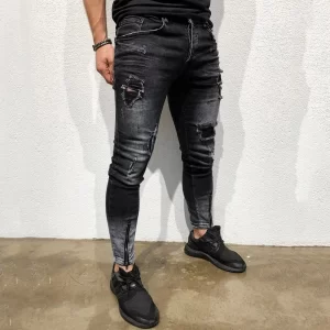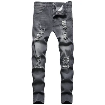 Men's black casual ripped jeans, men's slim fashion casual denim trousers
