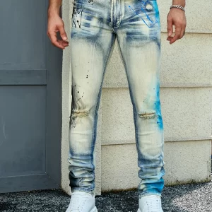 Men's denim stretch hand-painted print, knee holes Slim fit Jeans