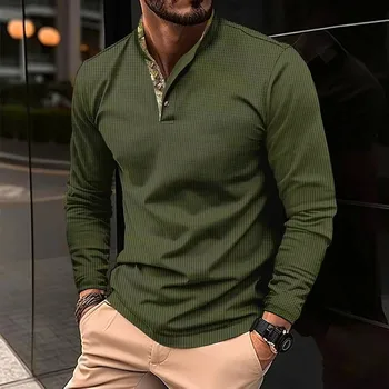 Autumn Fashion Men Long Sleeve Slim Fit T-shirt Retro Solid Color Stand Collar Cotton Linen Tshirt Male Simple T-shirt