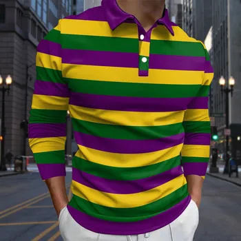 Carnival Print Men Polo Shirt Casual Fashion Matching Color Striped 3D Digital Print Button Casual Lapel Long Sleeve T Shirt