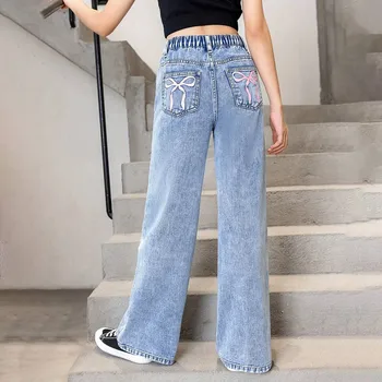 Women's Bow Pearl Tassel Lace Casual Loose High Waist Jeams Pants.