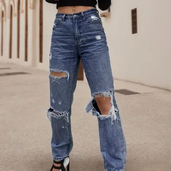 Women's Denim Elastic Button Loose High Waist Streetwear Vintage Denim Jeans Pants.