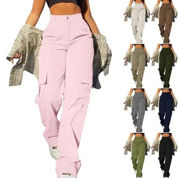 Womens High Waisted Straight Leg Cargo Multi-Pocket Streetwear Trousers.