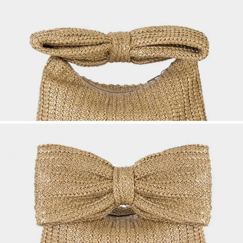 Straw Bow Purse Women Clutch Bag Bohemian Crescent Clutch Foldable Bow Handle Zipper Closure Straw Braided Handbag