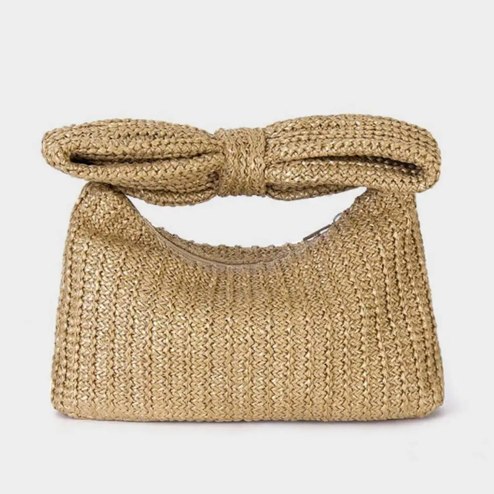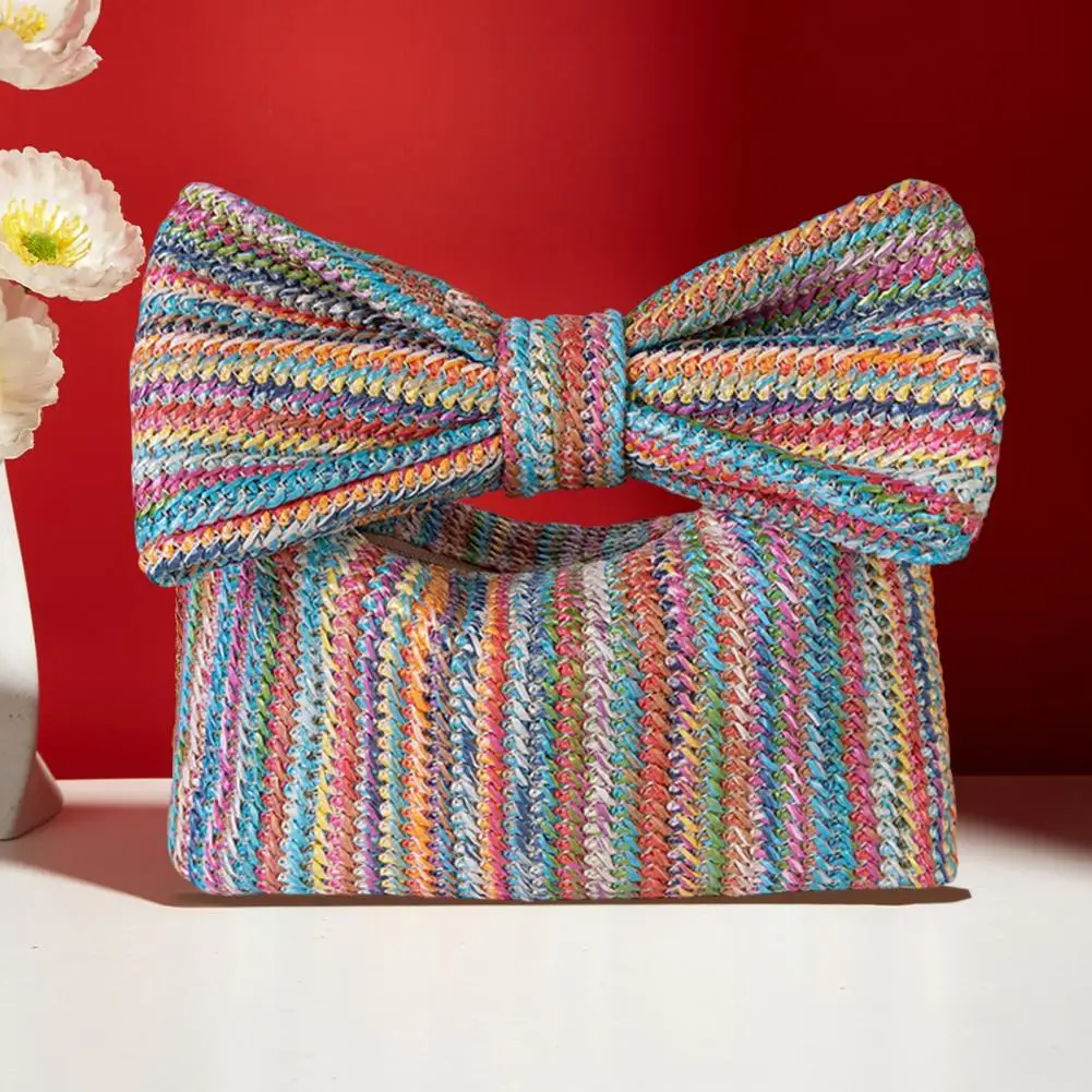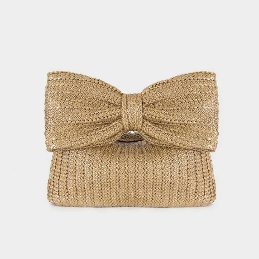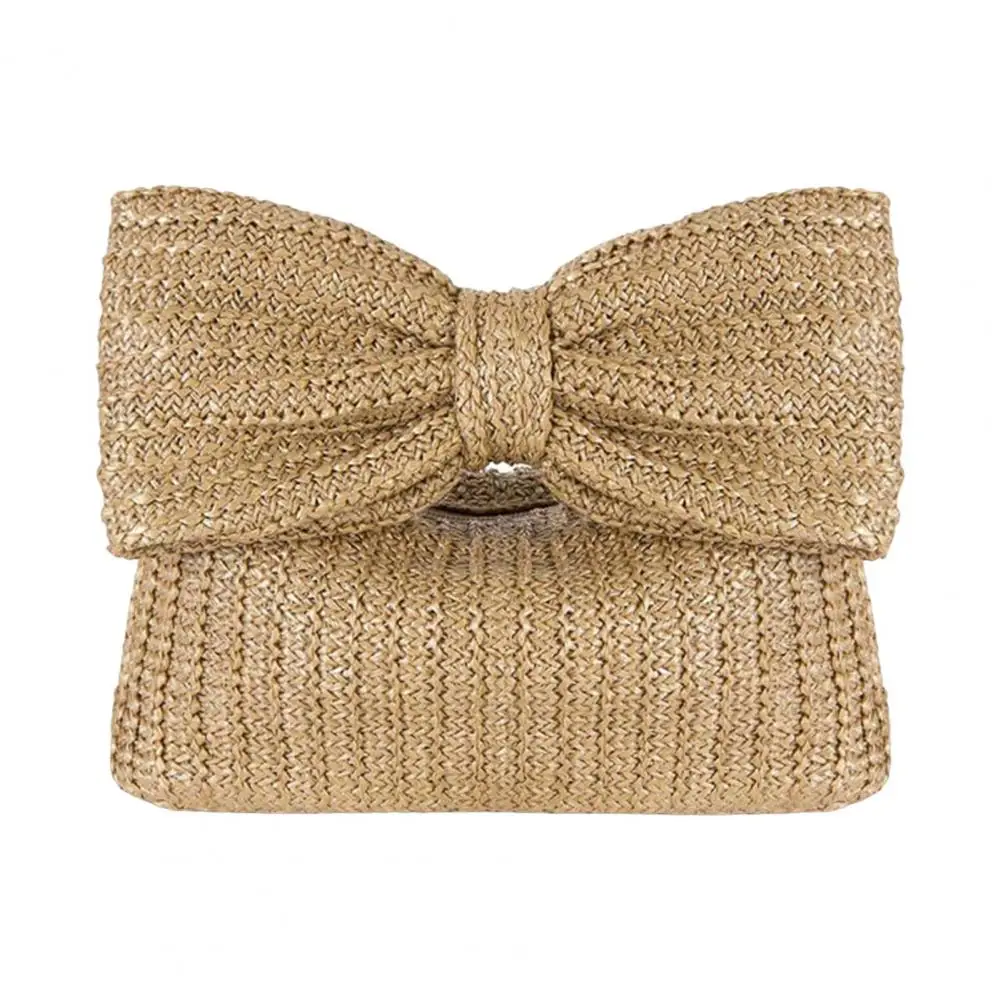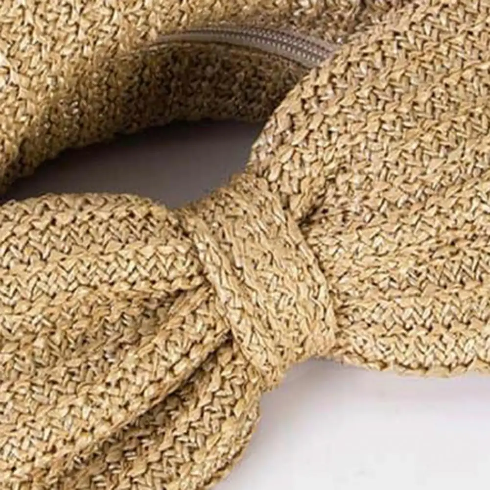 Lightweight and compact, its bow-tie dumpling shape ensures a spacious interior while maintaining a cute and stylish appearance. Get your hands on this versatile and practical straw bow clutch bag today!
