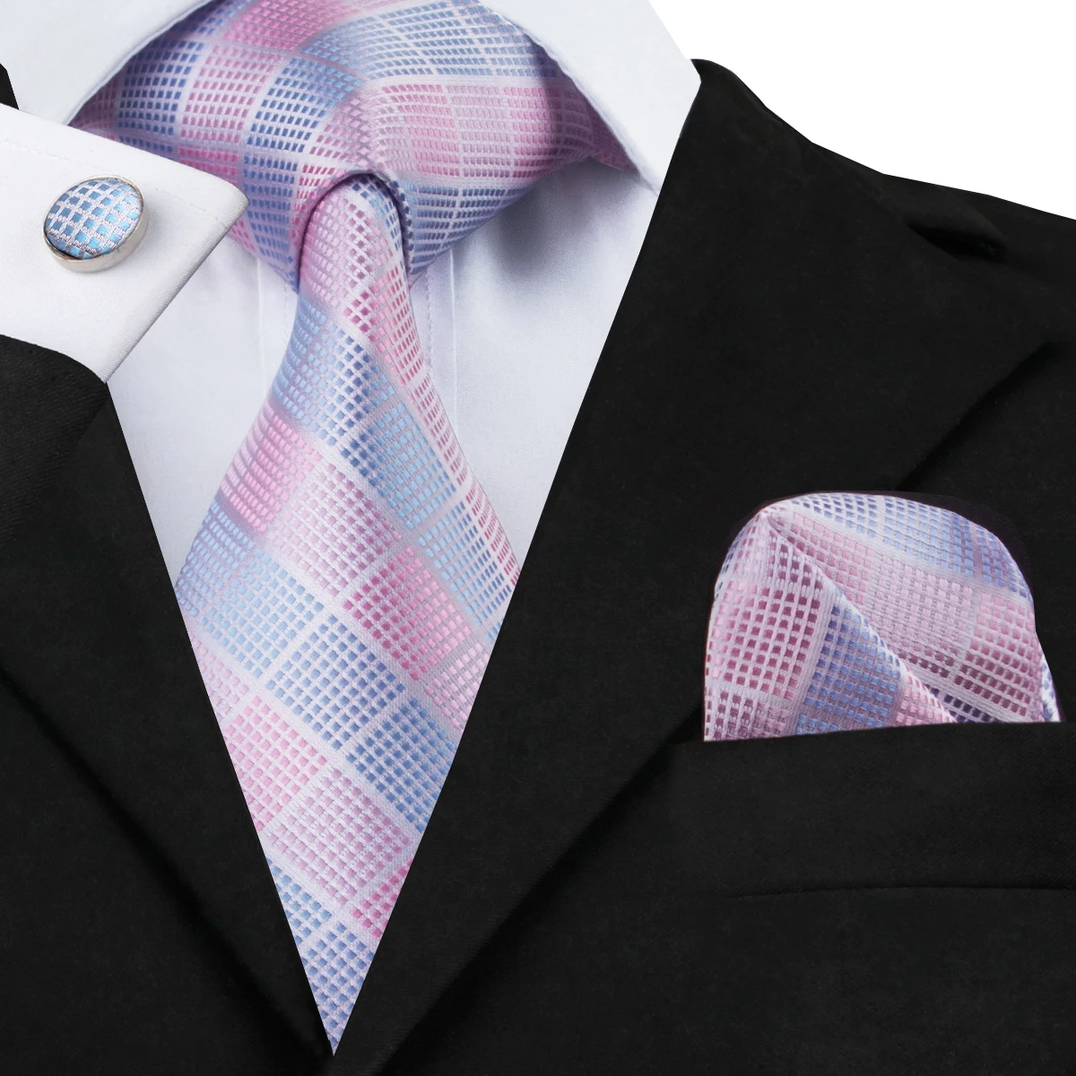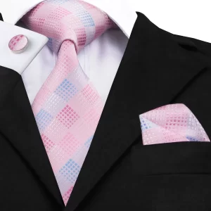 C-1198 Silk Jacquard Tie Set – Light Blue & Pink Plaid with Hanky & Cufflinks, for Men