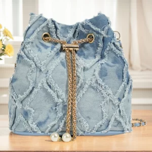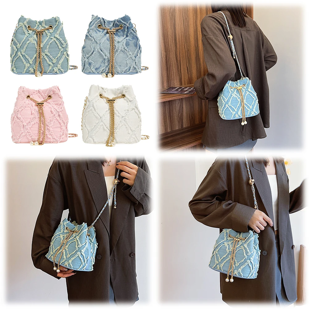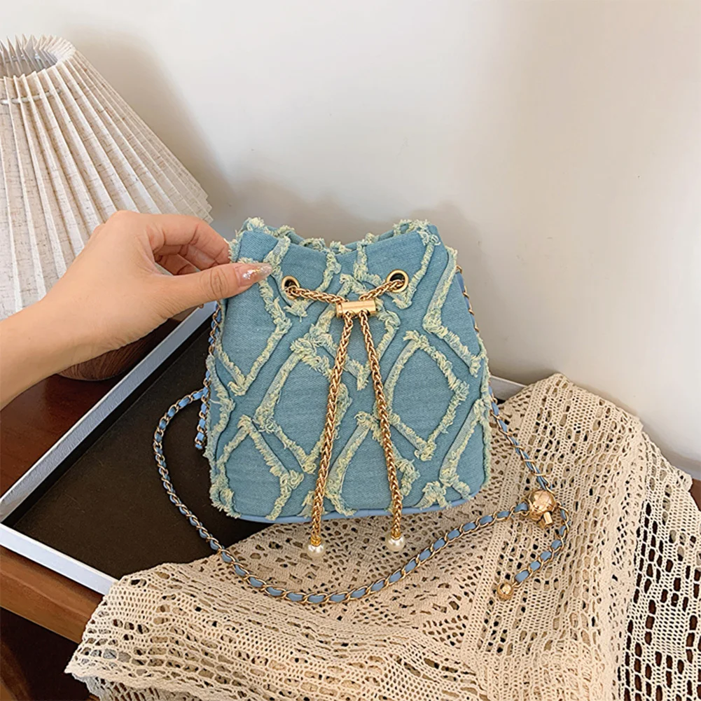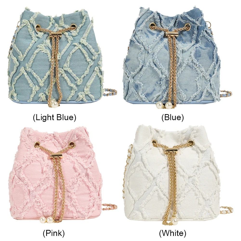 Denim Bucket Bag Diamond Pattern Women Crossbody Bag Drawstring Shoulder Bag Adjustable Strap Hobo Bag Travel Bag