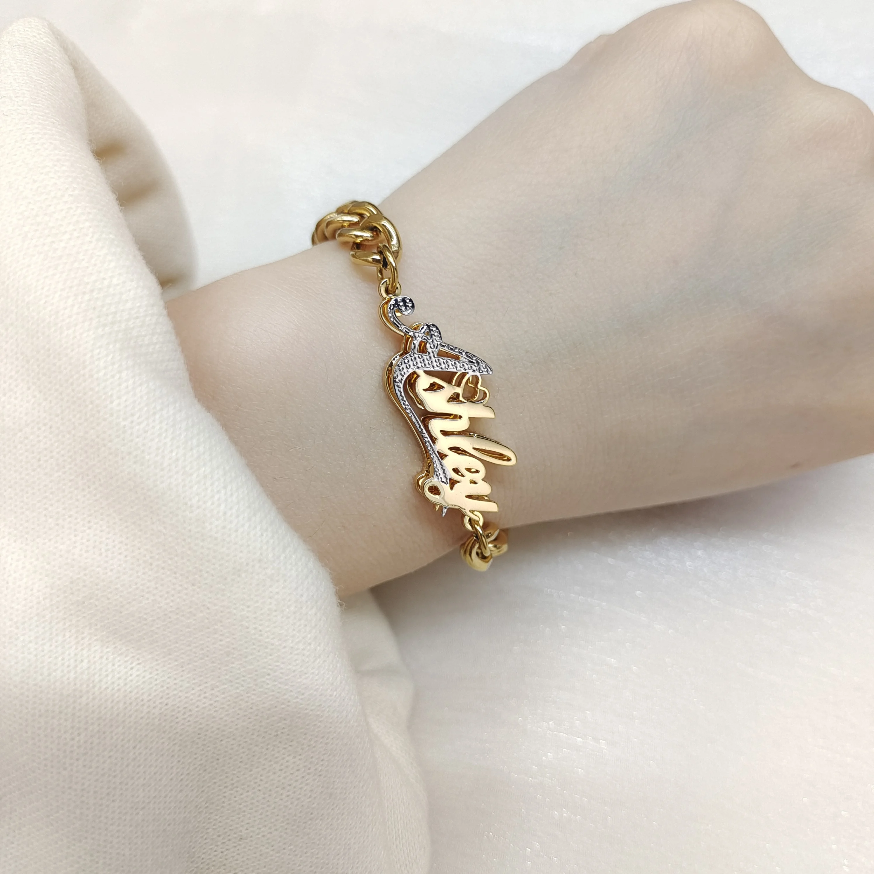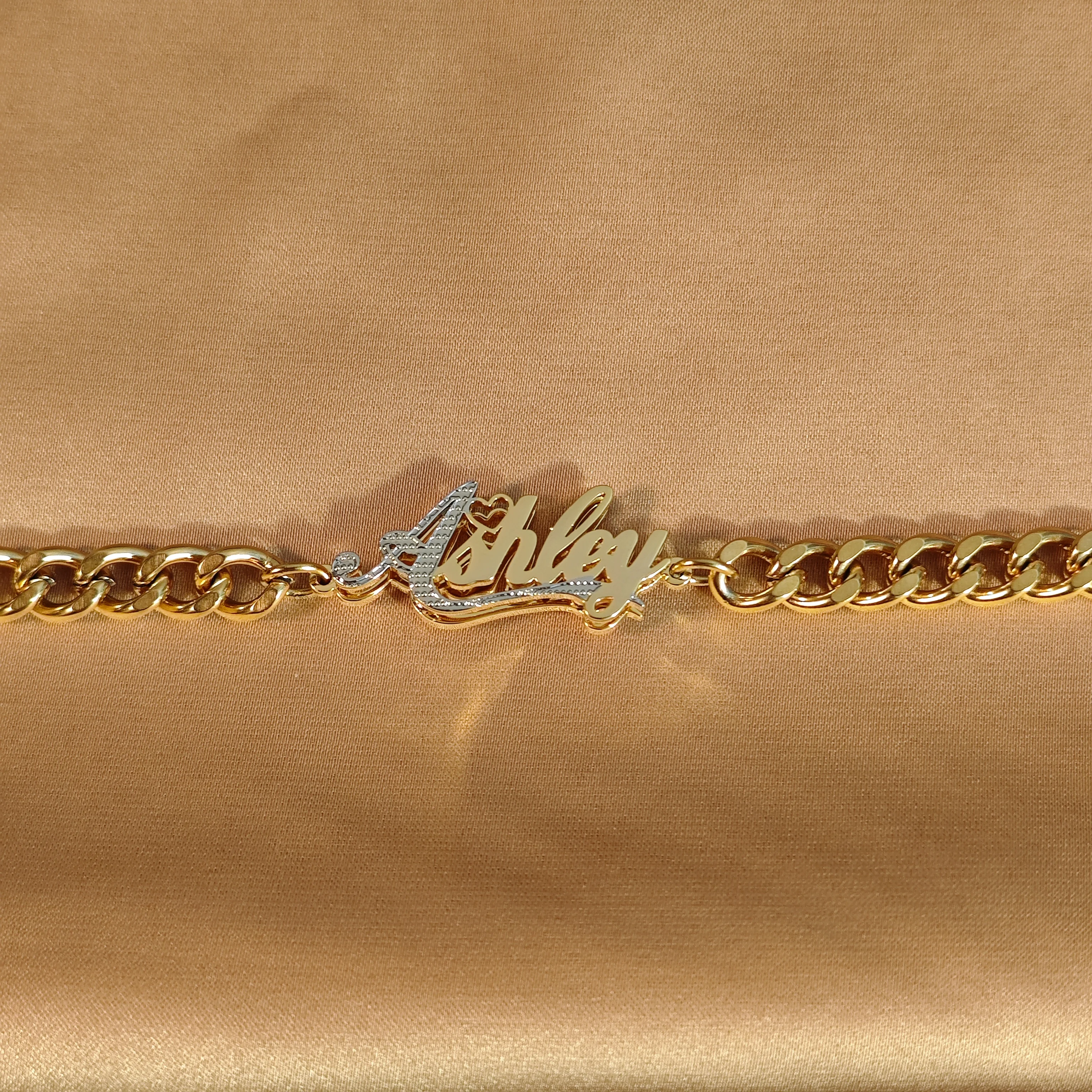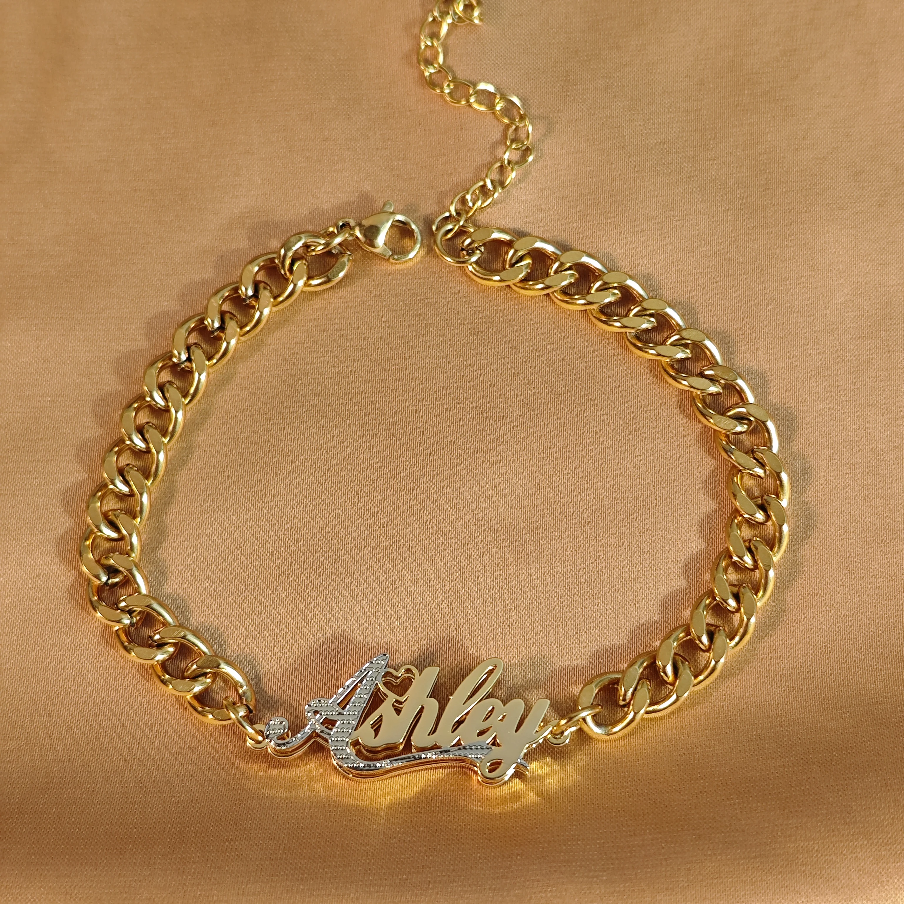 Our double plated custom name anklet adds a touch of personalized charm to any occasion. Beautifully crafted, this anklet features your initials in two colors, dangling from a stylish Cuban chain. Made for the fashion forward, this anklet is a versatile accessory for any occasion. Perfect as a birthday gift, it symbolizes true sentiment and unique style. This exquisite personalized anklet will enhance your jewelry collection".