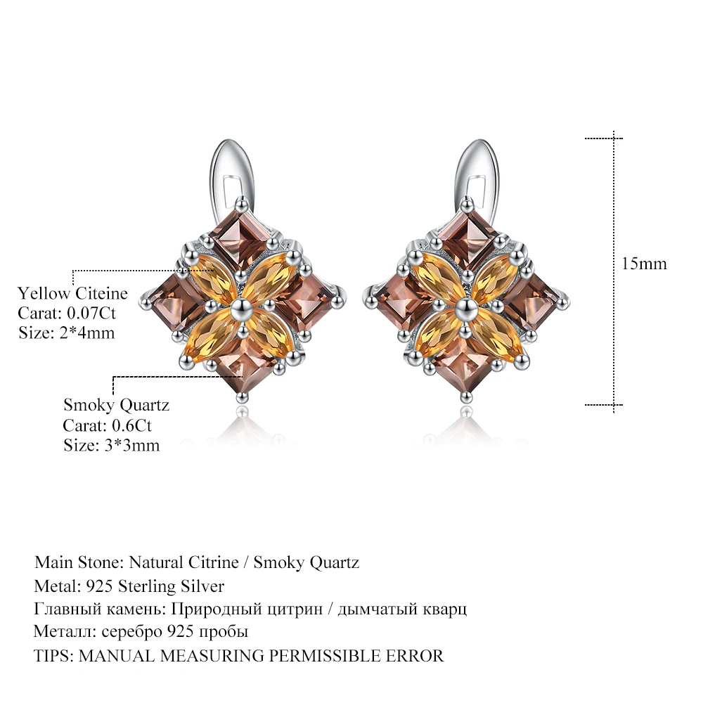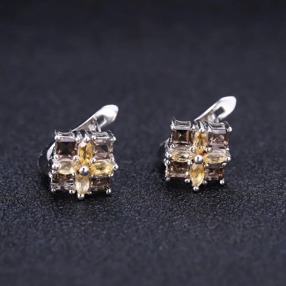 Gem’s Ballet Multicolor Citrine & Smoky Quartz Flower Stud Earrings – 925 Sterling Silver