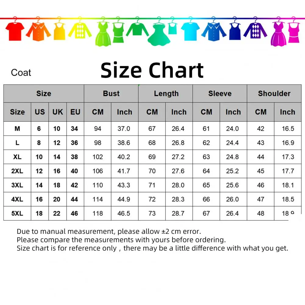 Size: 5XL, Shoulder: 48cm/18.9″, Bust: 118cm/46.5″, Length: 73cm/28.7″, Sleeve: 67cm/26.4″ (Approx.)