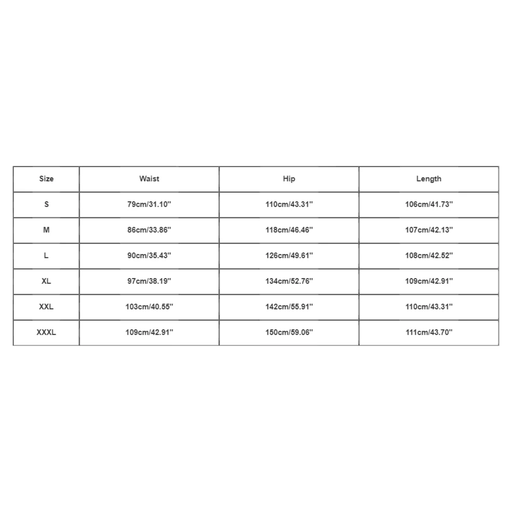 | Size:S | Waist:79cm/31.10” | Hip:110cm/43.31” | Length:106cm/41.73” |