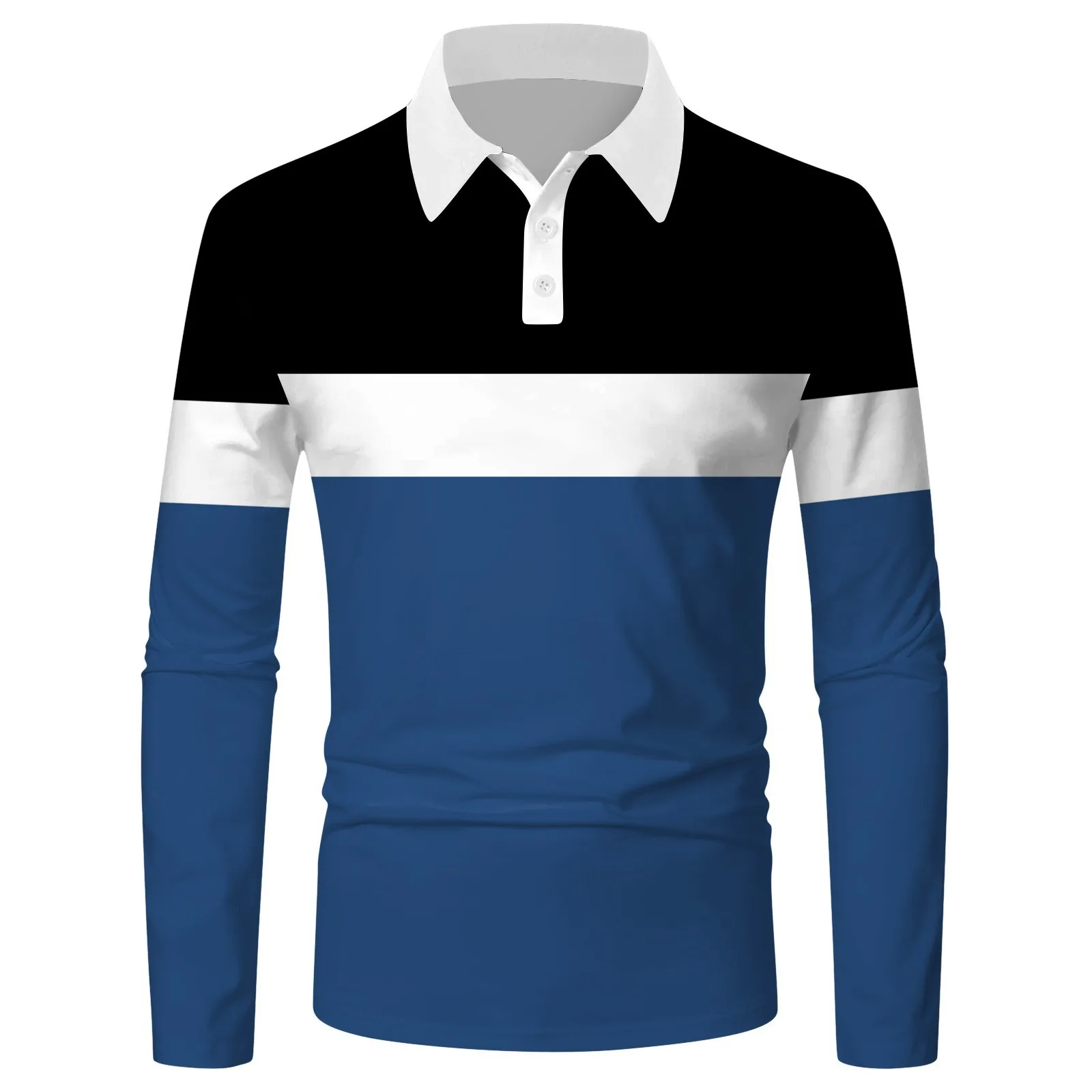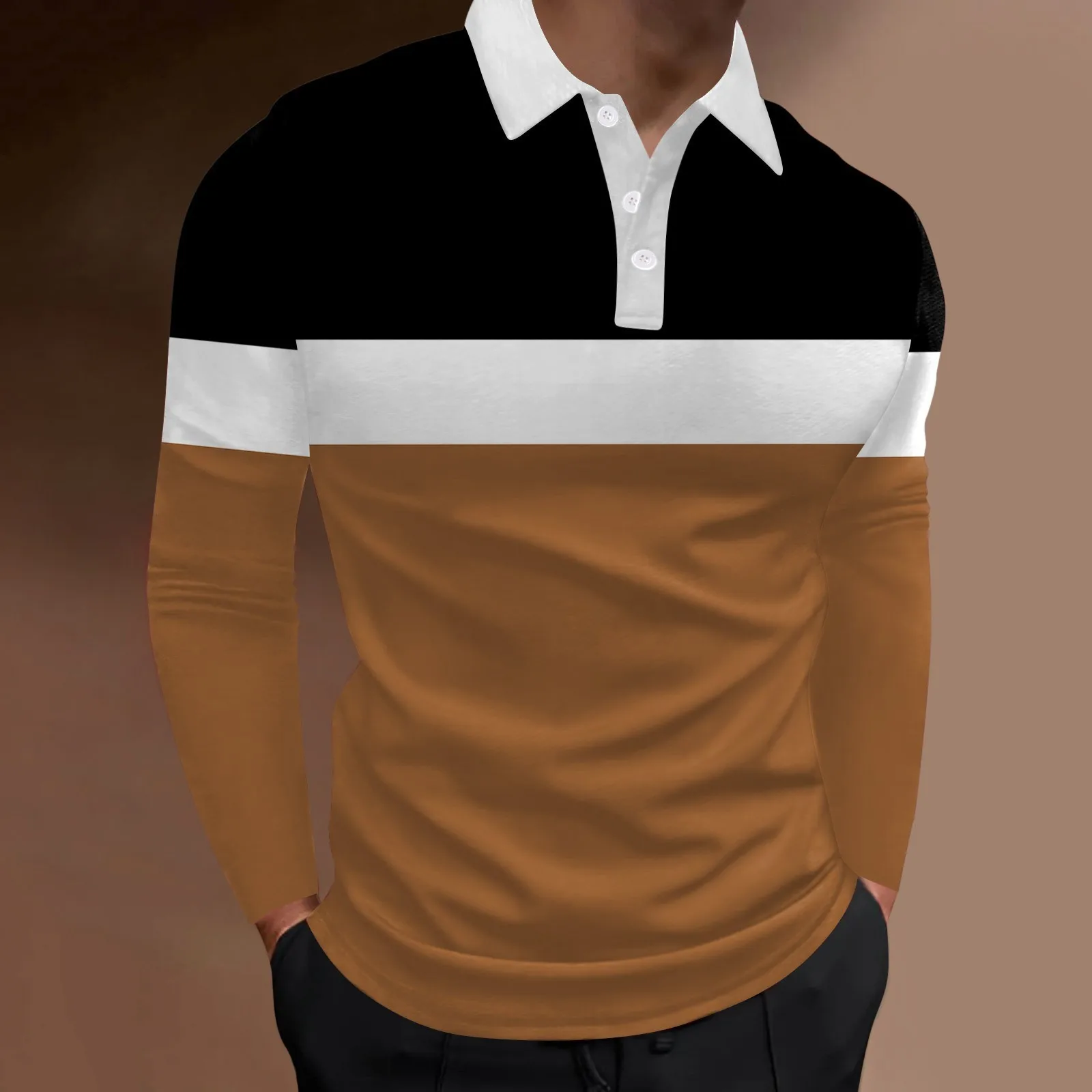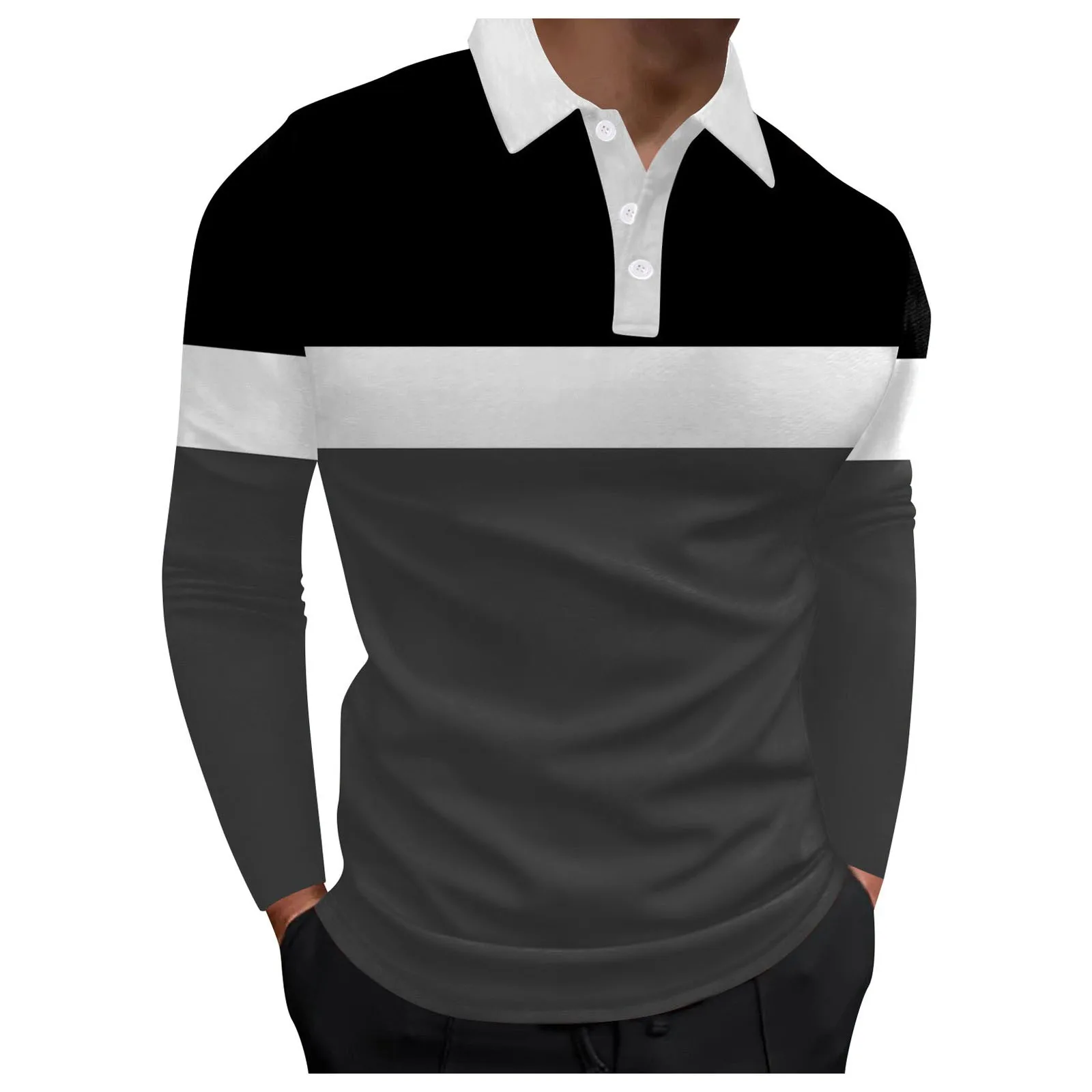 Men’s Four Seasons Leisure Fashion Stitching Color Contrast Design Lapel Button Long Sleeve Top
