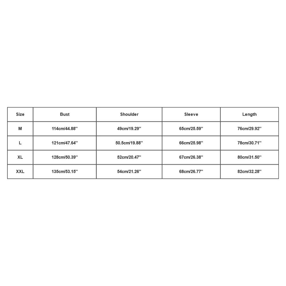 | Size:XL | Bust:128cm/50.39” | Shoulder:52cm/20.47” | Sleeve:67cm/26.38” | Length:80cm/31.50” |