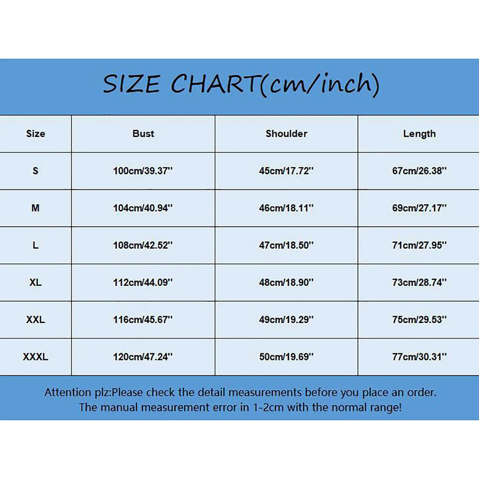 Size:XXXL Bust:120cm/47.24” Shoulder:50cm/19.69” Length:77cm/30.31”