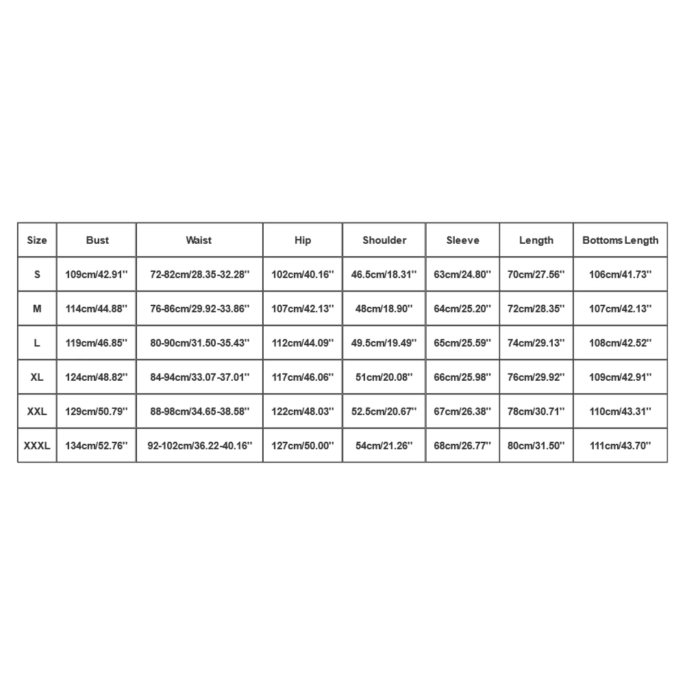 | Size:XXXL | Bust:134cm/52.76” | Waist:92-102cm/36.22-40.16” | Hip:127cm/50.00” | Shoulder:54cm/21.26” | Sleeve:68cm/26.77” | Length:80cm/31.50” | Bottoms Length:111cm/43.70” |