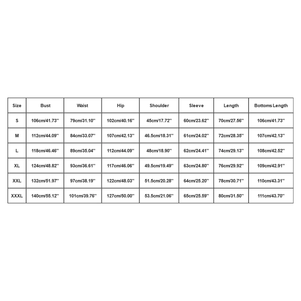 | Size:XXL | Bust:132cm/51.97” | Waist:97cm/38.19” | Hip:122cm/48.03” | Shoulder:51.5cm/20.28” | Sleeve:64cm/25.20” | Length:78cm/30.71” | Bottoms Length:110cm/43.31” |