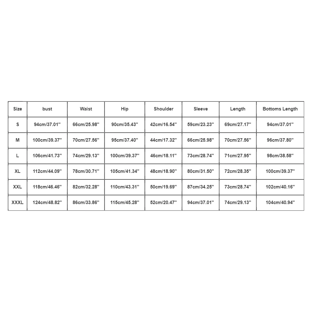 Size:XXXL bust:124cm/48.82” Waist:86cm/33.86” Hip:115cm/45.28” Shoulder:52cm/20.47” Sleeve:94cm/37.01” Length:74cm/29.13” Bottoms Length:104cm/40.94”
