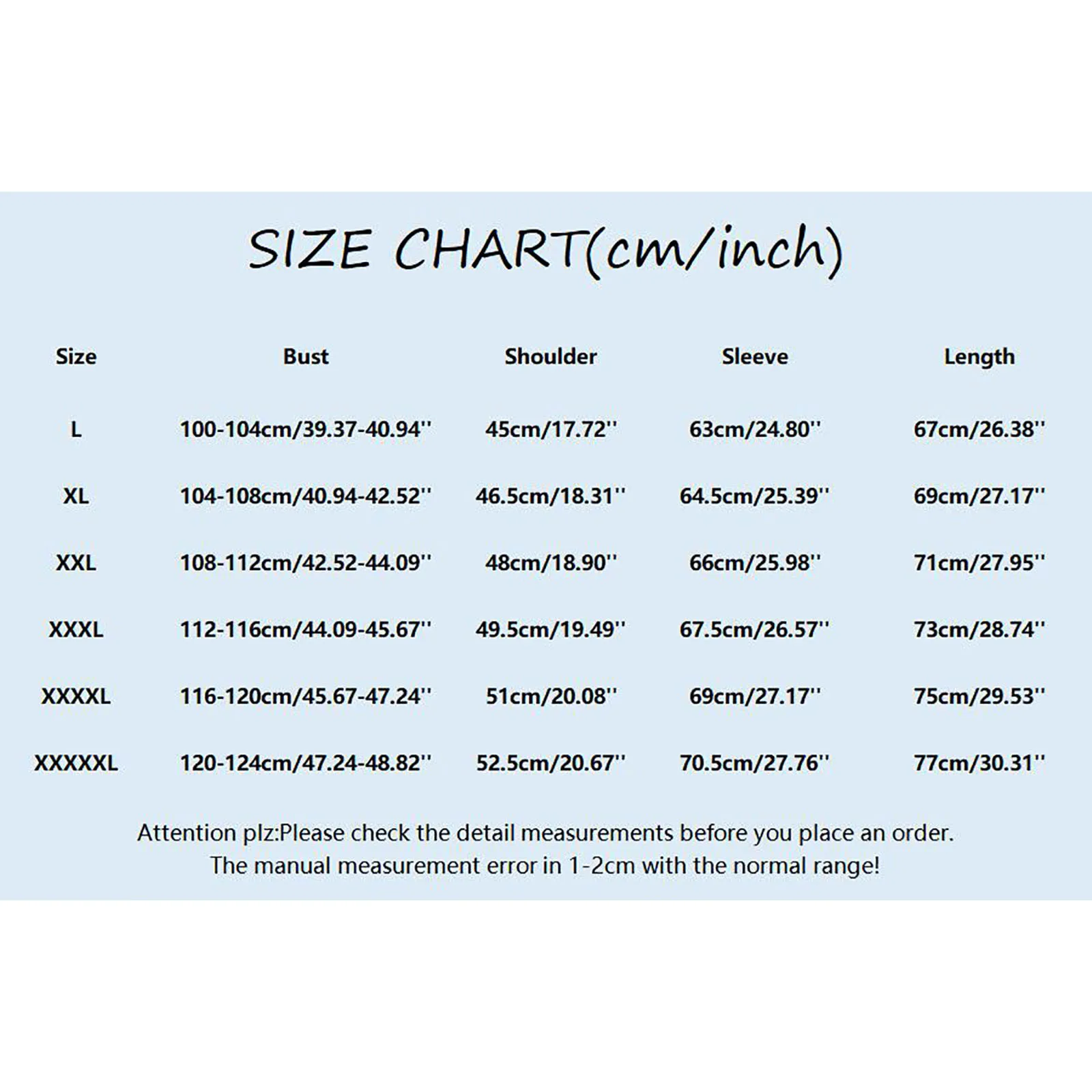 | Size:XXXXXL | Bust:120-124cm/47.24-48.82” | Shoulder:52.5cm/20.67” | Sleeve:70.5cm/27.76” | Length:77cm/30.31” |