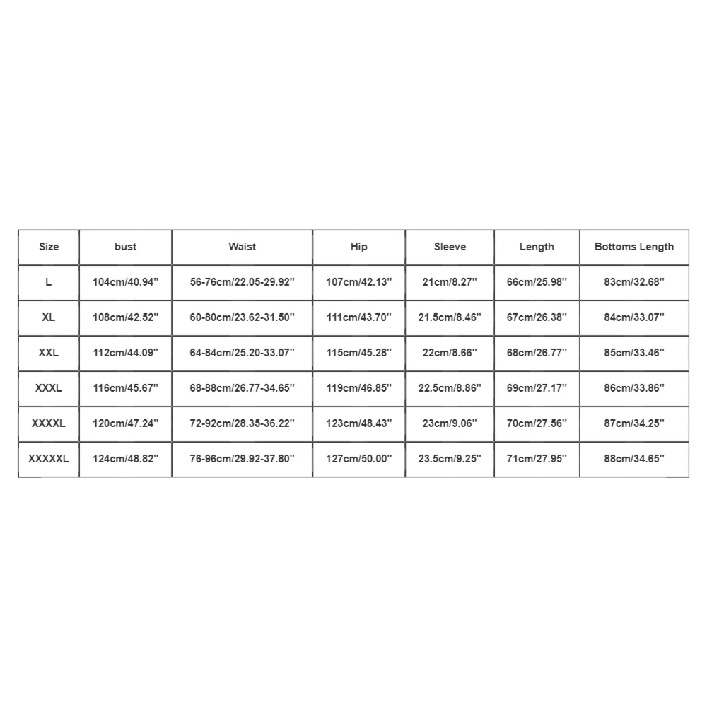 Size:XXXXXL bust:124cm/48.82” Waist:76-96cm/29.92-37.80” Hip:127cm/50.00” Sleeve:23.5cm/9.25” Length:71cm/27.95” Bottoms Length:88cm/34.65”
