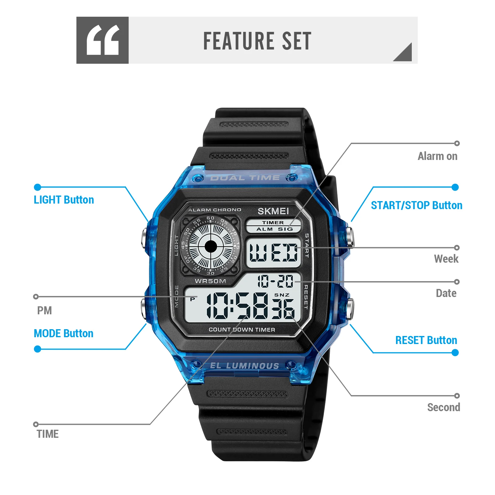 ▪ Functions: Count Down,Water Resistant,Chronograph,Alarm Clock,12/24 Hour Clock,,EL Light,Date