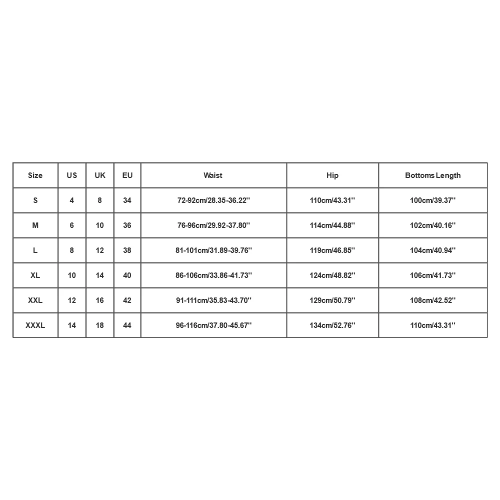 | Size:XXXL | US:14 | UK:18 | EU:44 | Waist:96-116cm/37.80-45.67” | Hip:134cm/52.76” | Bottoms Length:110cm/43.31” |