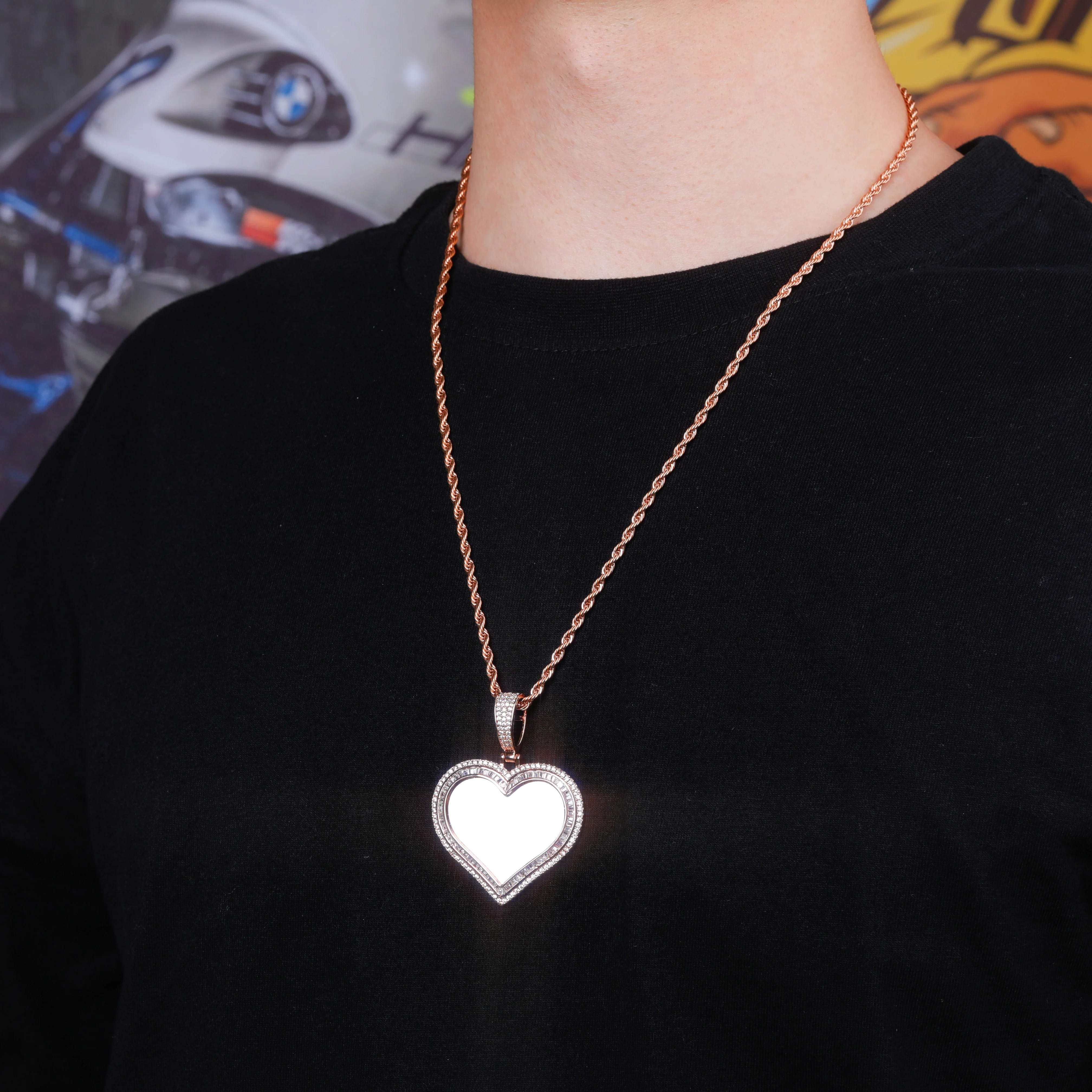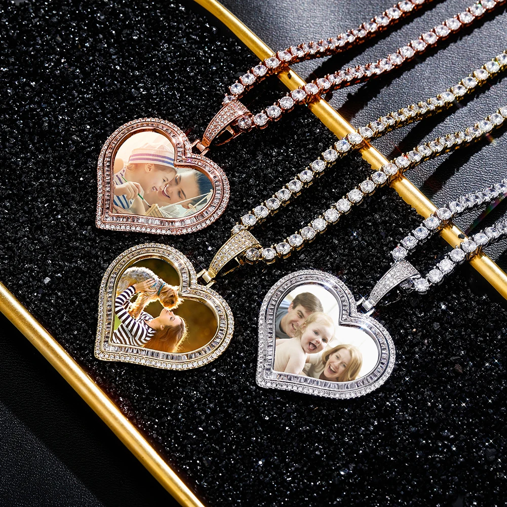 Custom Photo Heart Pendant Necklace – Iced Cubic Zirconia Hip Hop Jewelry for Men”