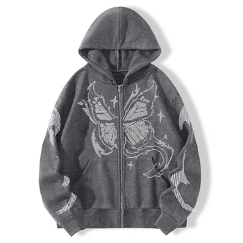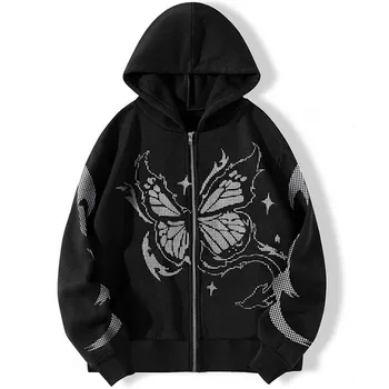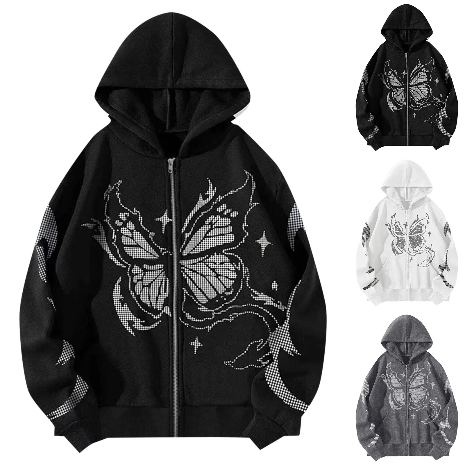 Womens Fashion Casual Monogram Print Long Sleeve Drawstring Hooded Sweatshirt Butterfly Print Zip Up Drawstring Thermal Hoodie