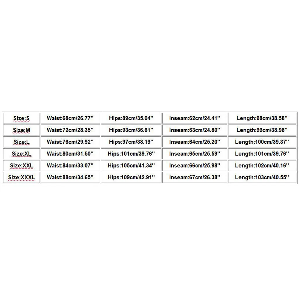 | Size:XXXL | Waist:88cm/34.65” | Hips:109cm/42.91” | Inseam:67cm/26.38” | Length:103cm/40.55” |