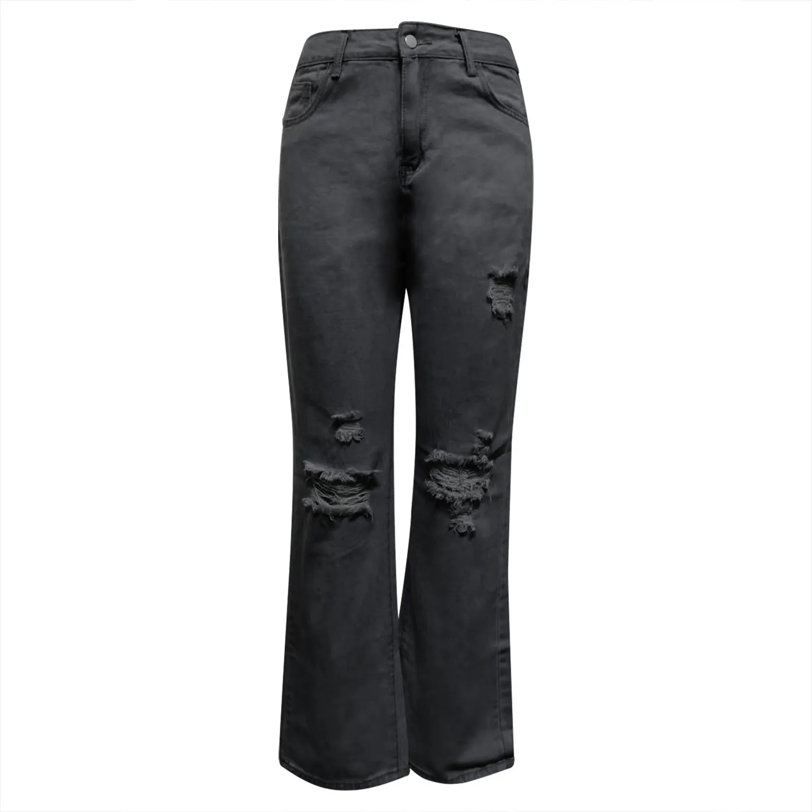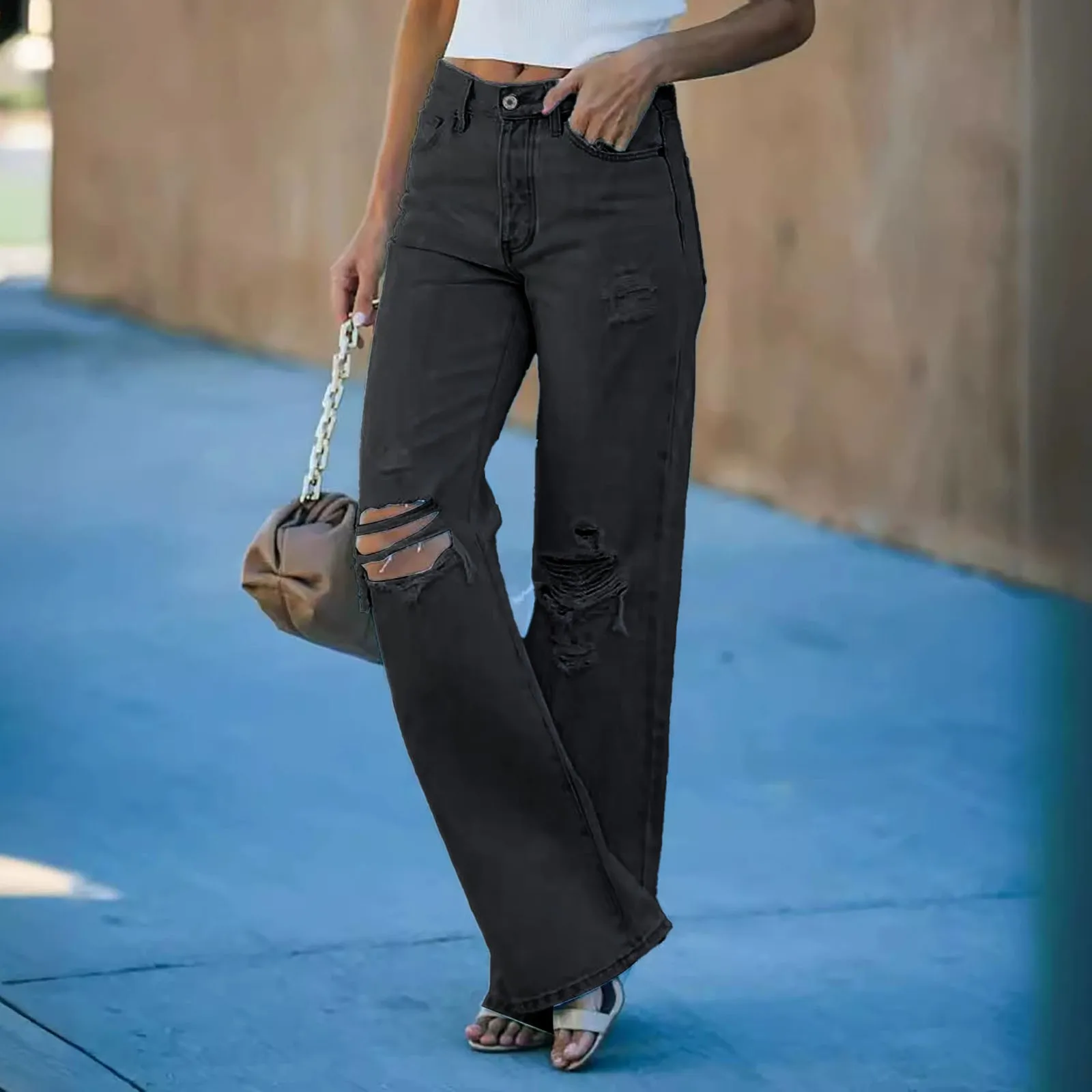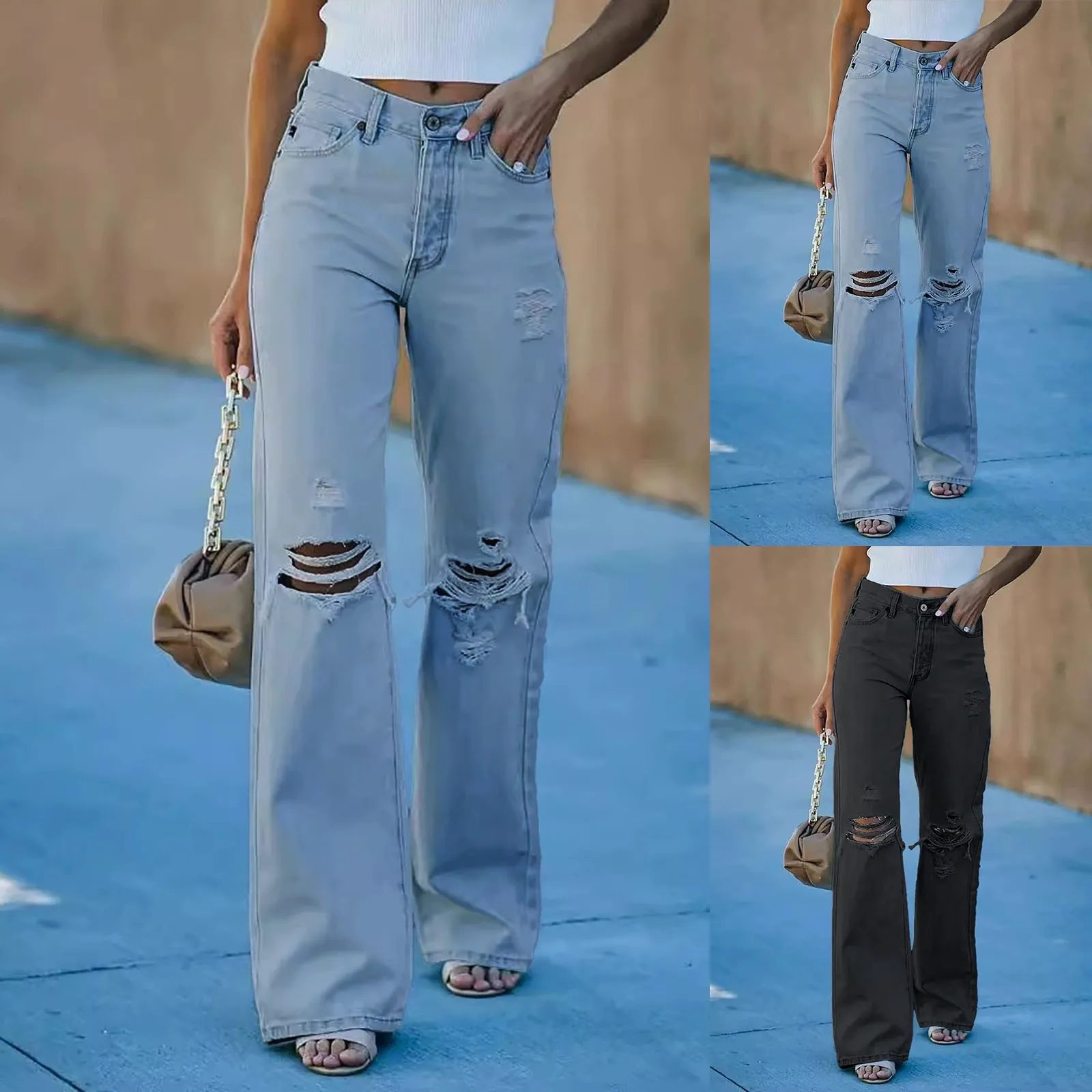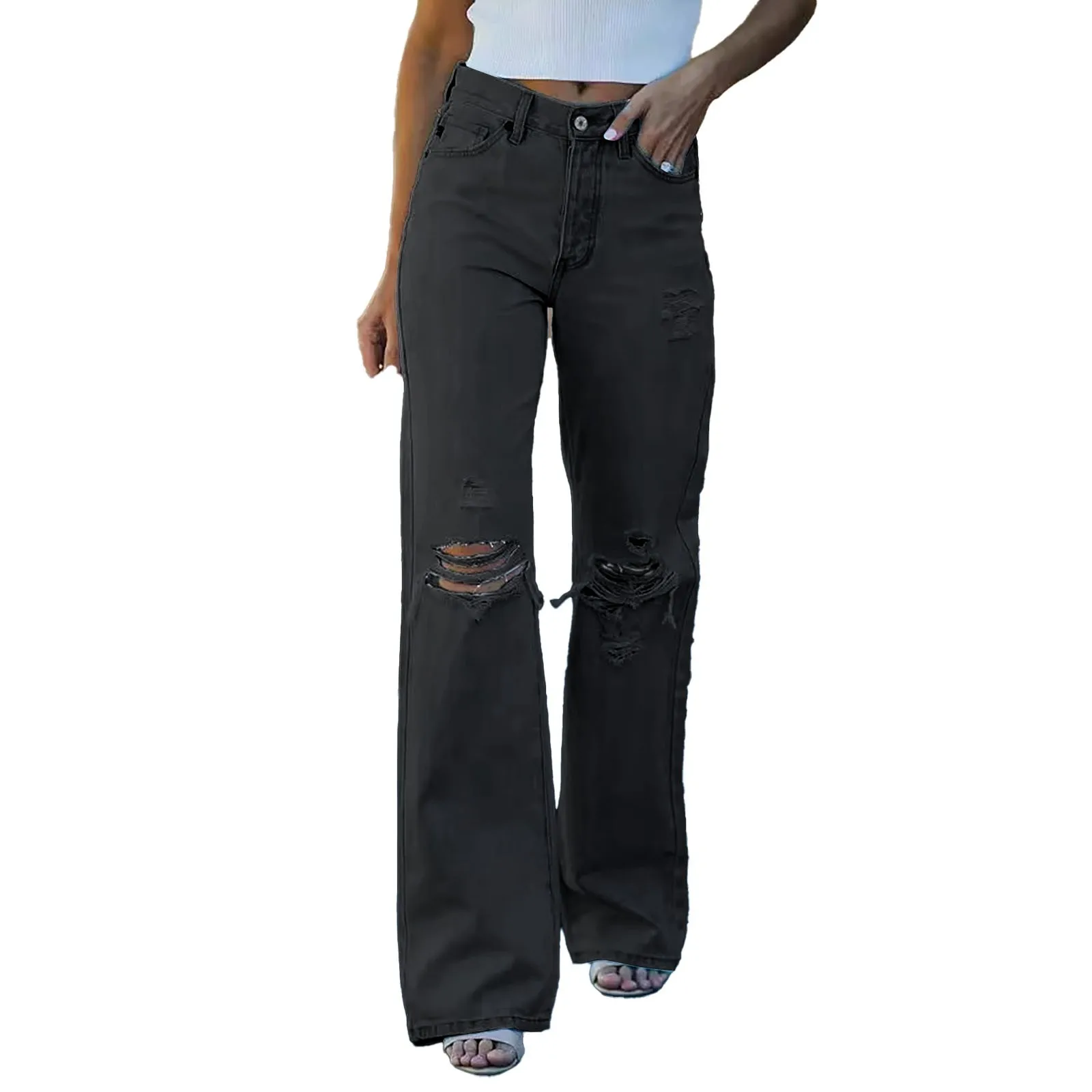 Women Ripped Hole High Waisted Straight Leg Denim Streetwear Baggy Jeans.