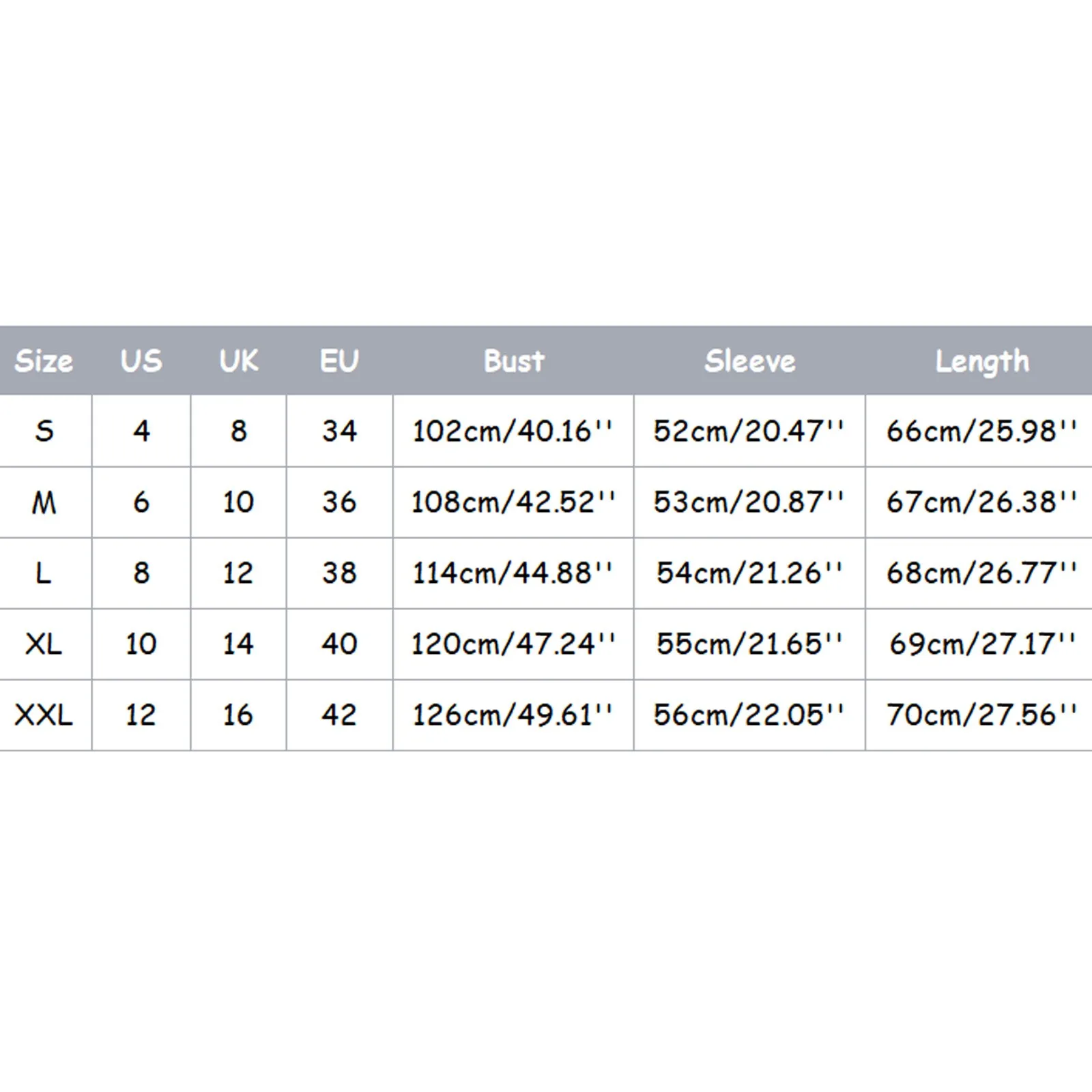 | Size:XL | US:10 | UK:14 | EU:40 | Bust:120cm/47.24” | Sleeve:55cm/21.65” | Length:69cm/27.17” |