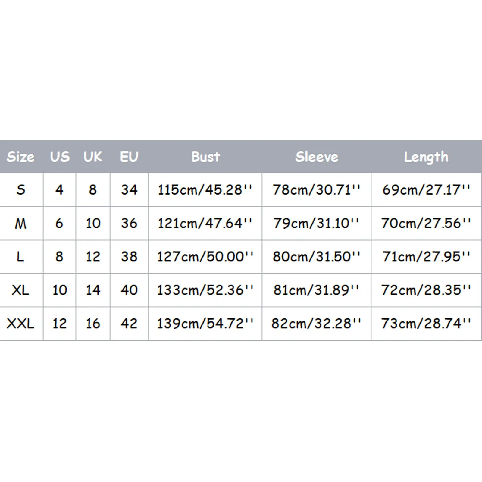 | Size:XL | US:10 | UK:14 | EU:40 | Bust:133cm/52.36” | Sleeve:81cm/31.89” | Length:72cm/28.35” |