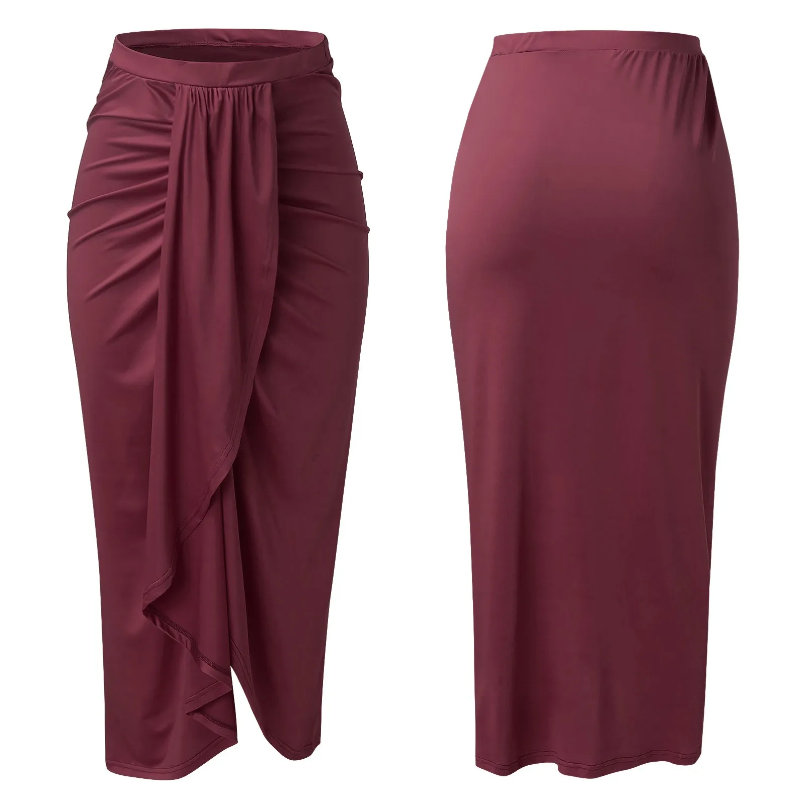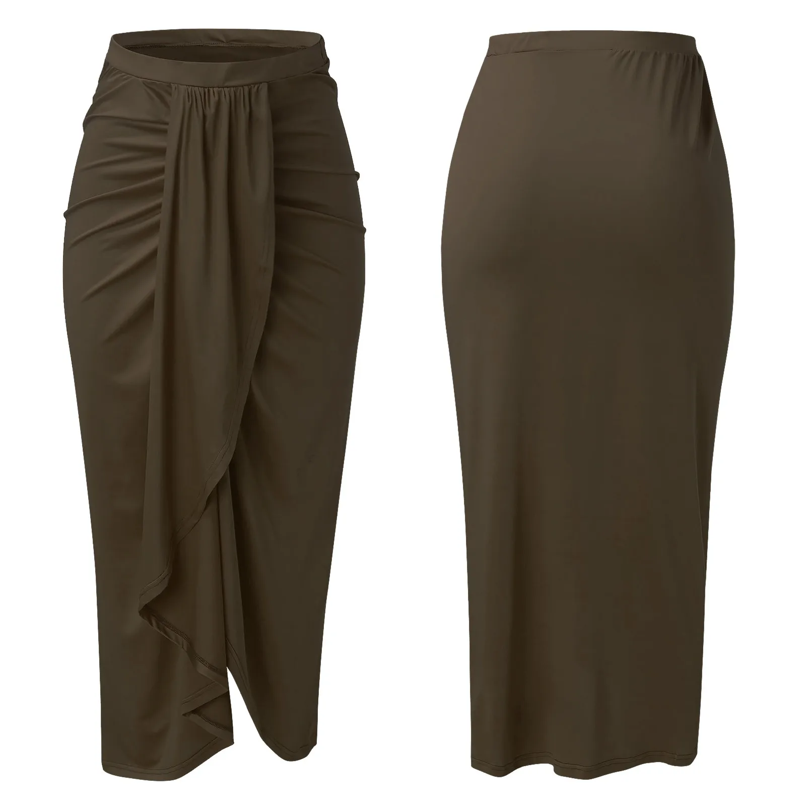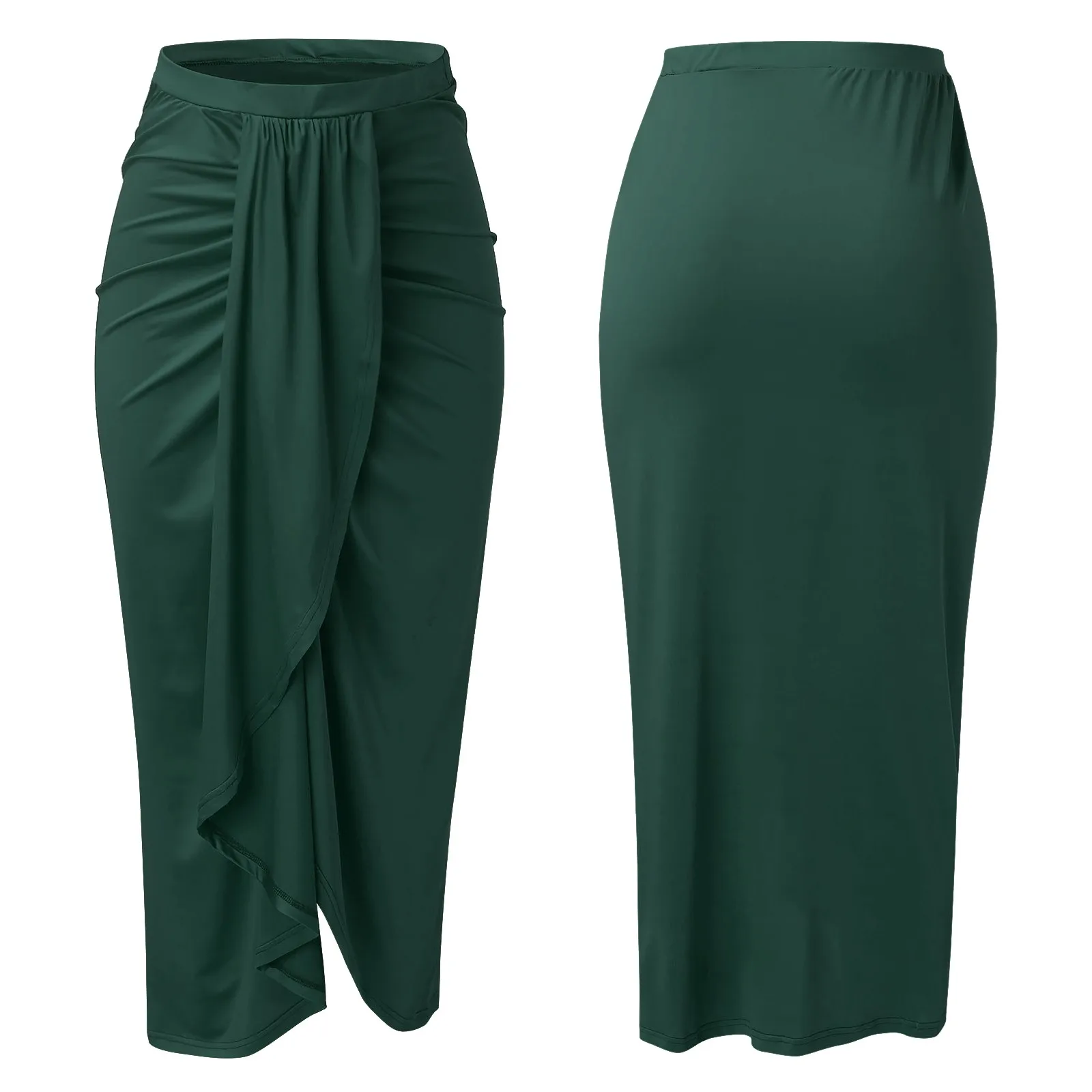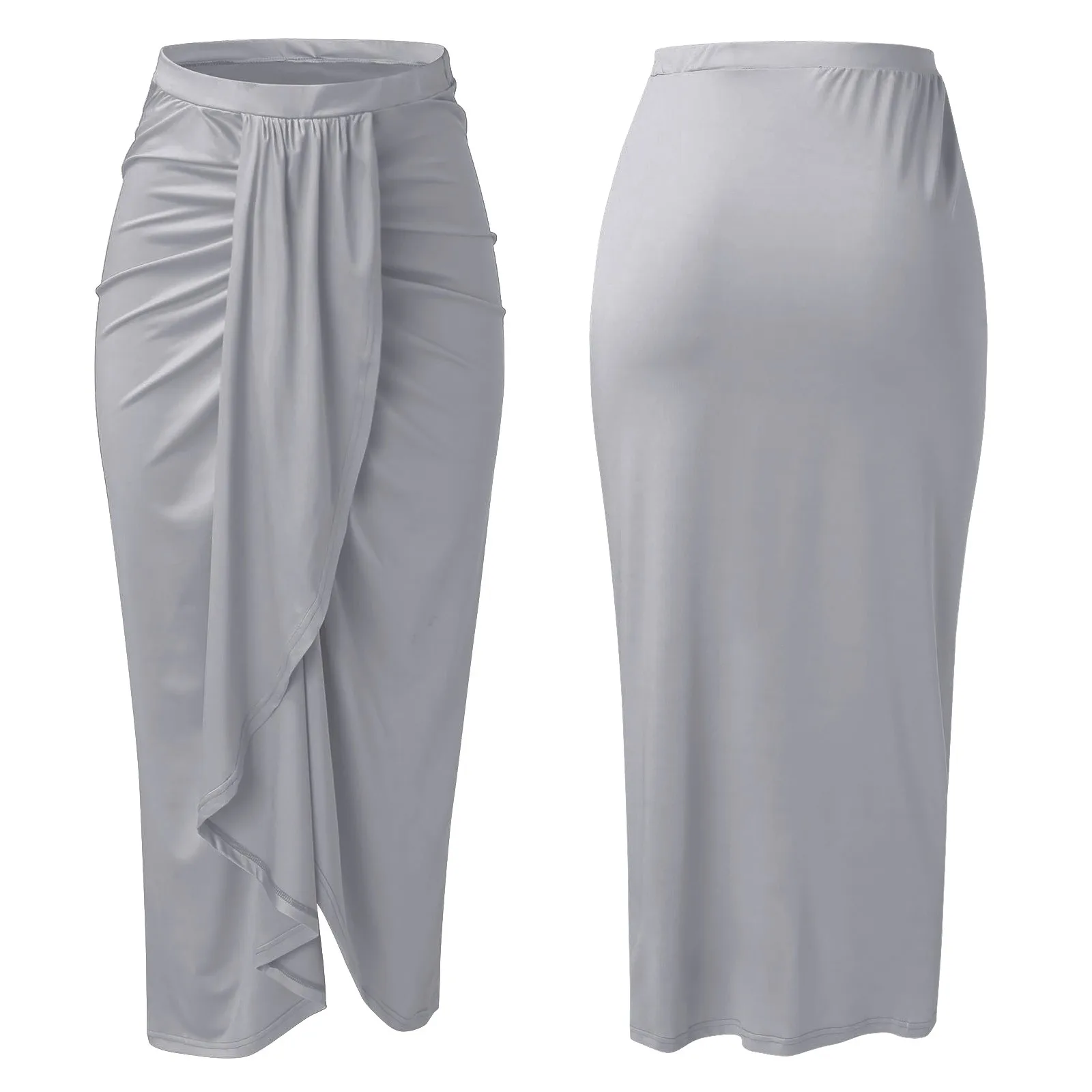 Women’s Casual Slit Wrap Asymmetrical Elastic High Waist Maxi Draped Solid Skirt
