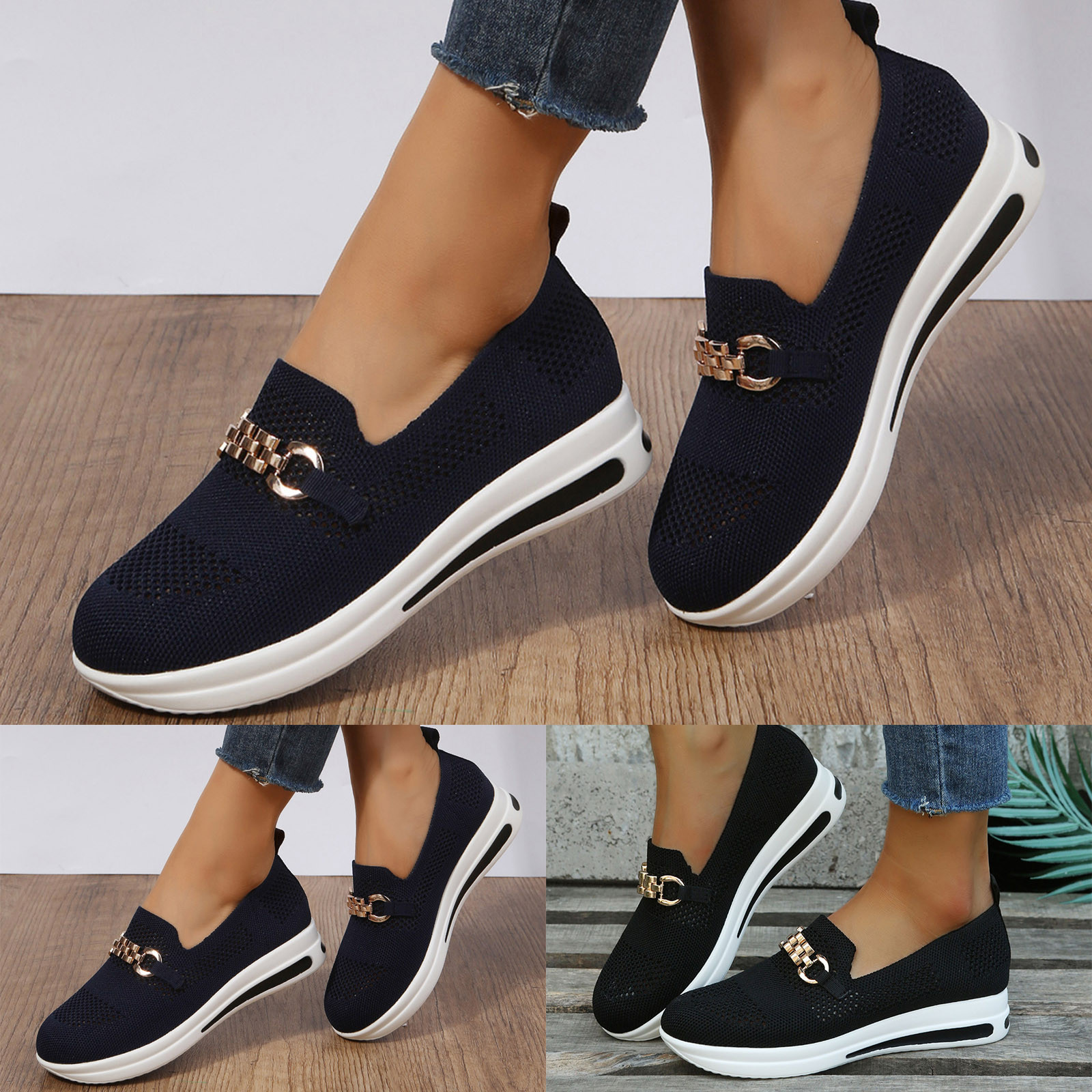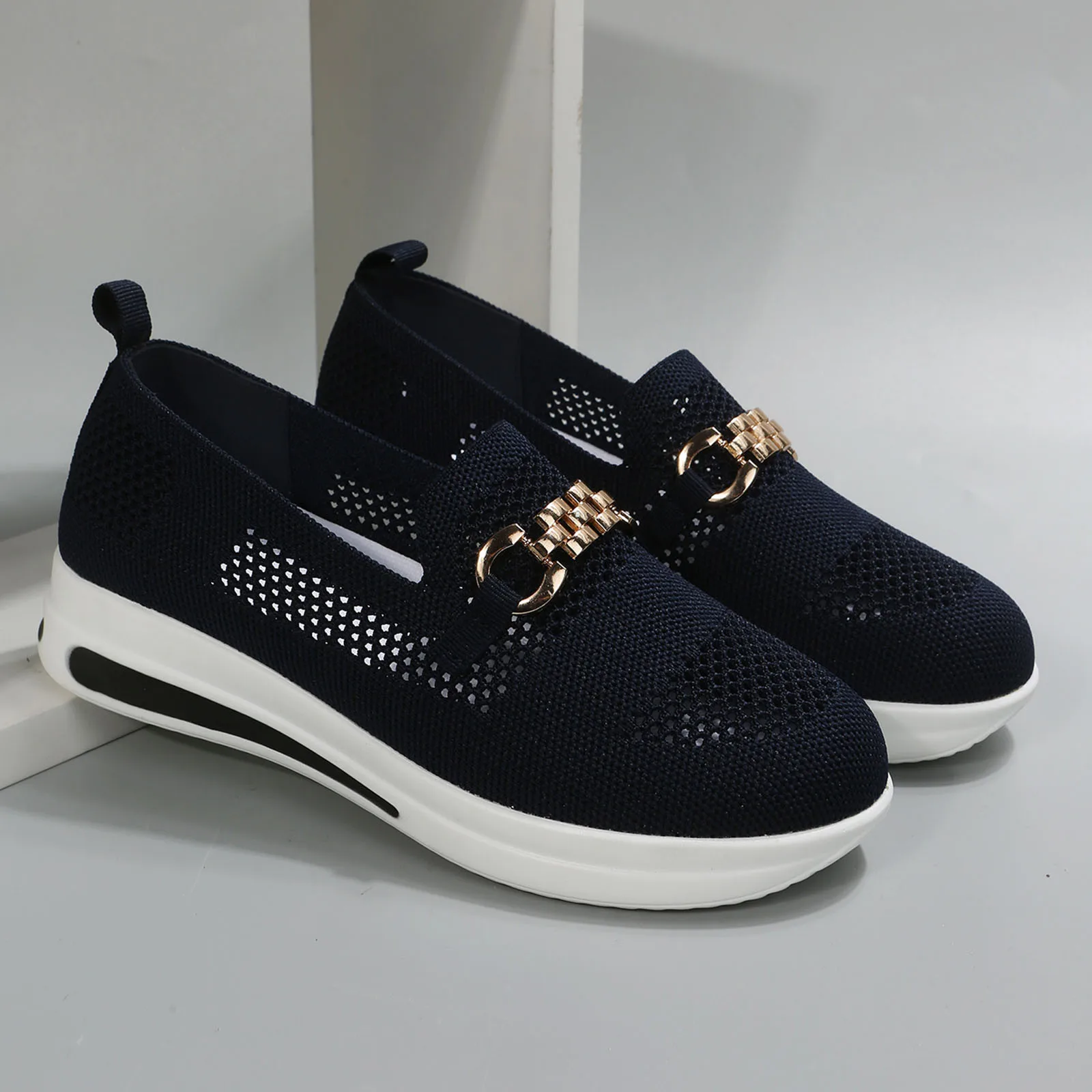 Ladies Fashion Metal Buckle Mesh Breathable Round Toe Thick Sole Casual Sports Shoes