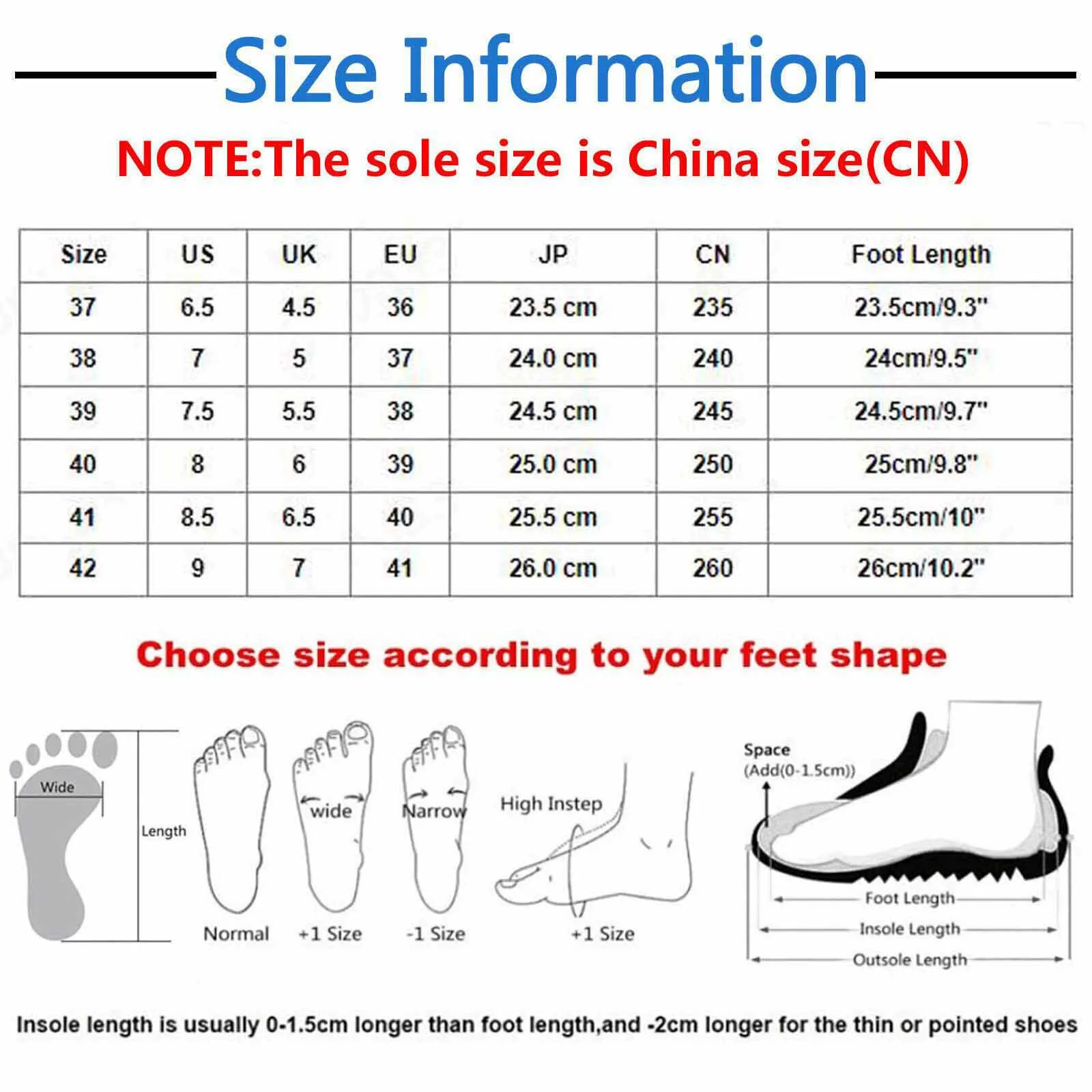 | Size:38 | US:7 | UK:5 | EU:37 | JP:24.0 cm | CN:240 | Foot Length:24cm/9.5″ |