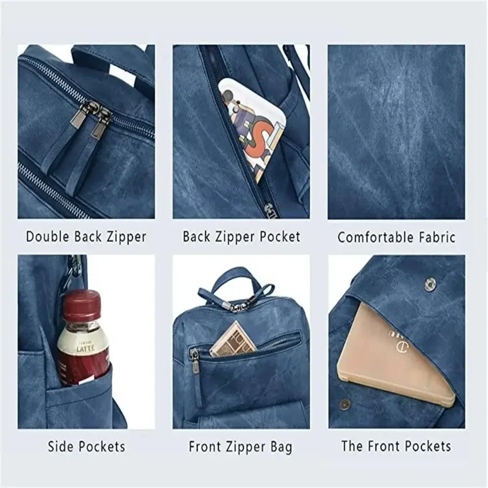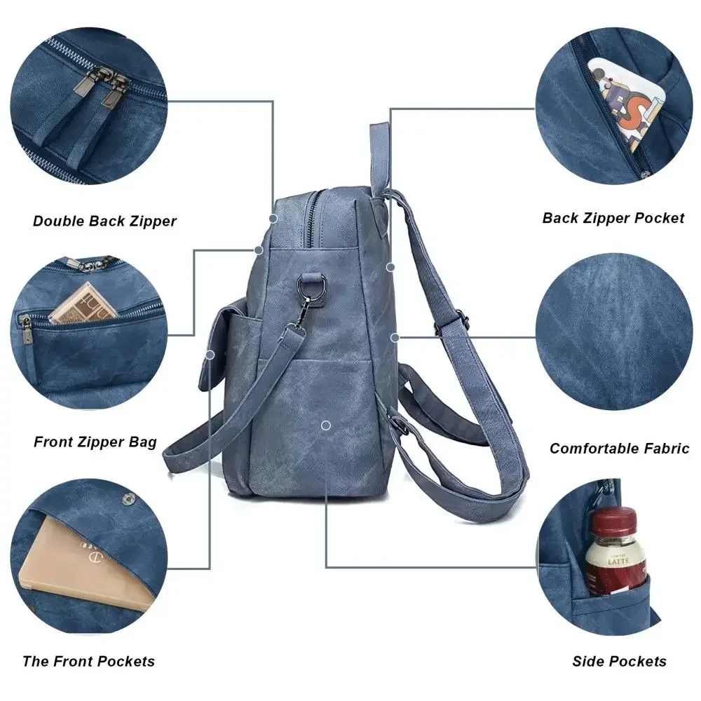 Women Backpck PU Leather Shoulders Bag Large Capacity Casual Zip Bag Blue