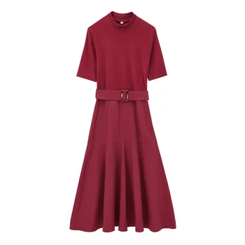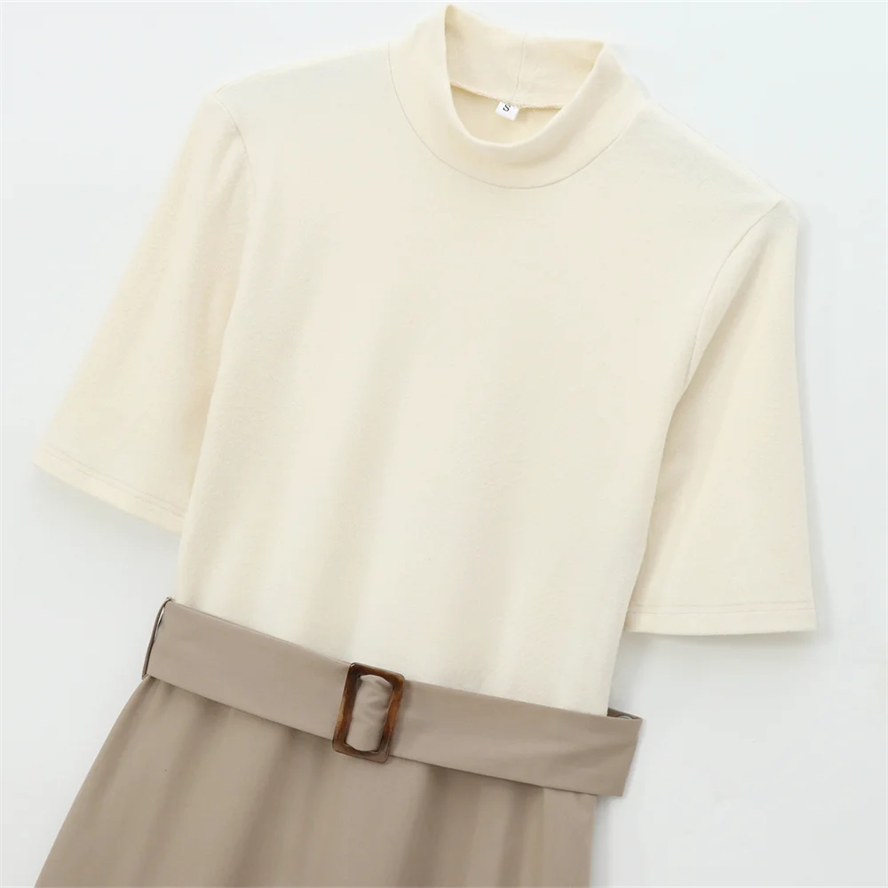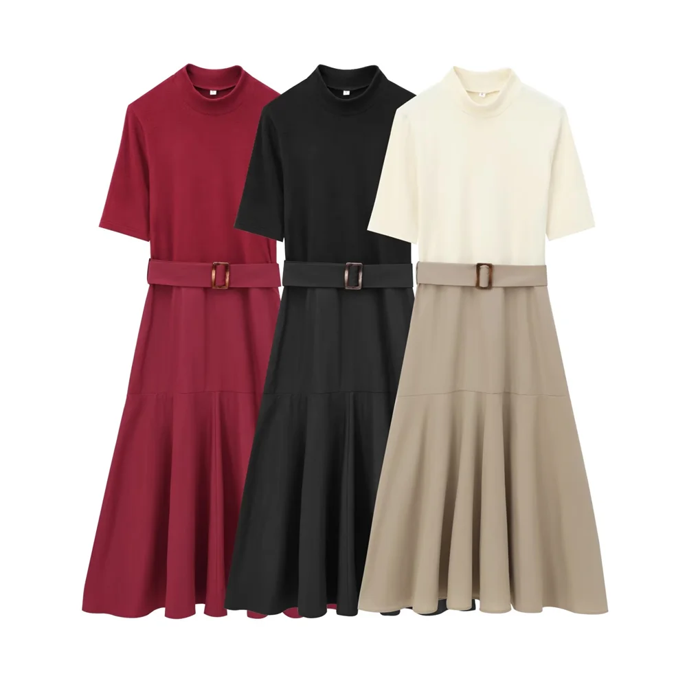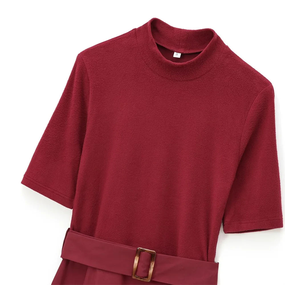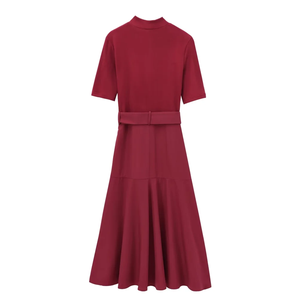 Women’s Retro Fashion Stand up Collar Short Sleeve with Belt Soft Slimming Dress