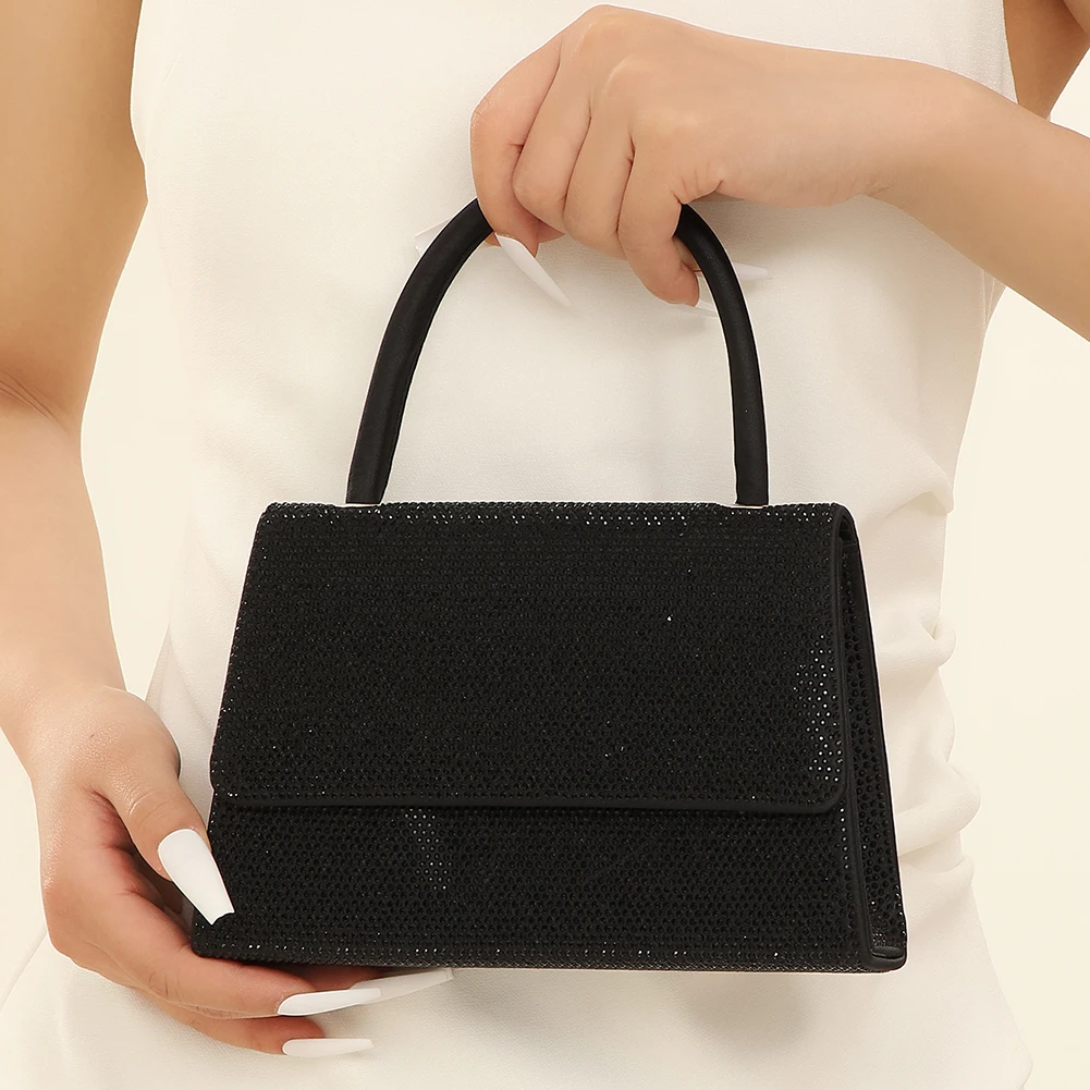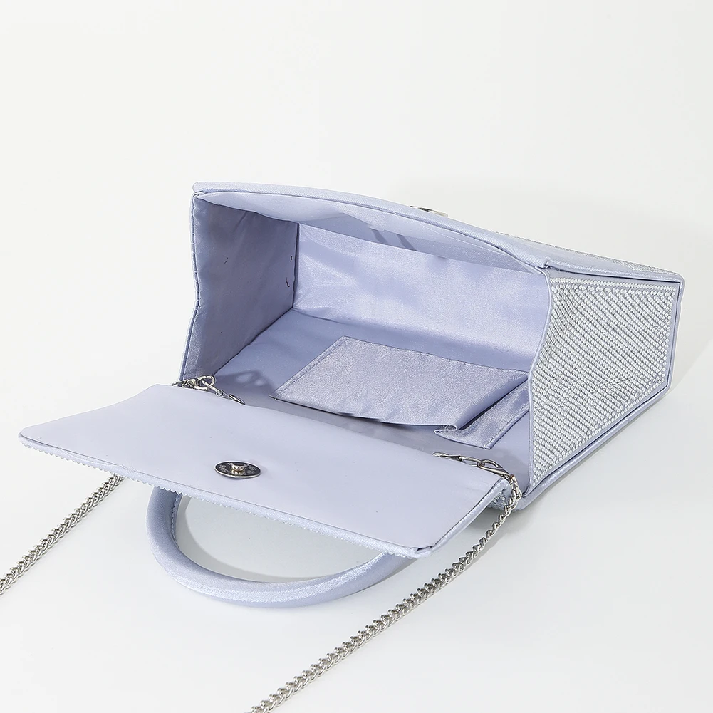 3. Elegant Design: This party clutch bag features an elegant design suitable for formal events such as weddings, parties, and dances. The top round handle and detachable chain strap add to its versatility, while the front flap is decorated with shimmering rhinestones.