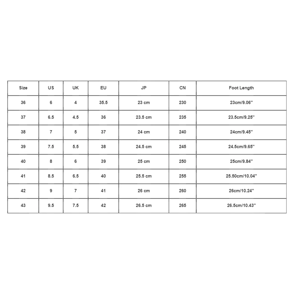 | Size:39 | US:7.5 | UK:5.5 | EU:38 | JP:24.5 cm | CN:245 | Foot Length:24.5cm/9.65” |