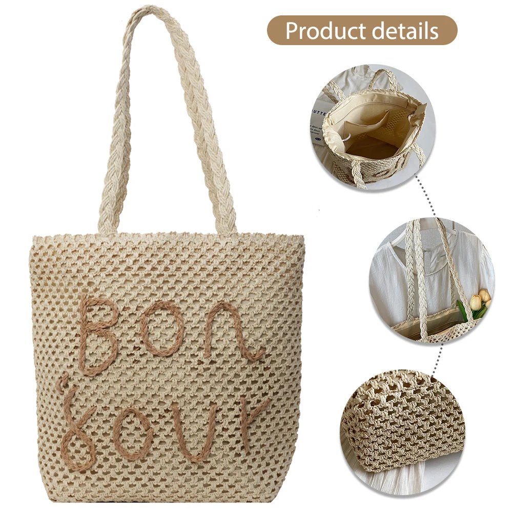 Women Letter Tote Handbag Large Capacity Hollow Out Handbag Versatile Crochet Travel Bag Female Straw Shoulder Bag