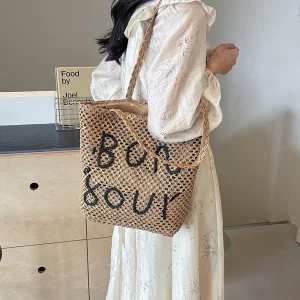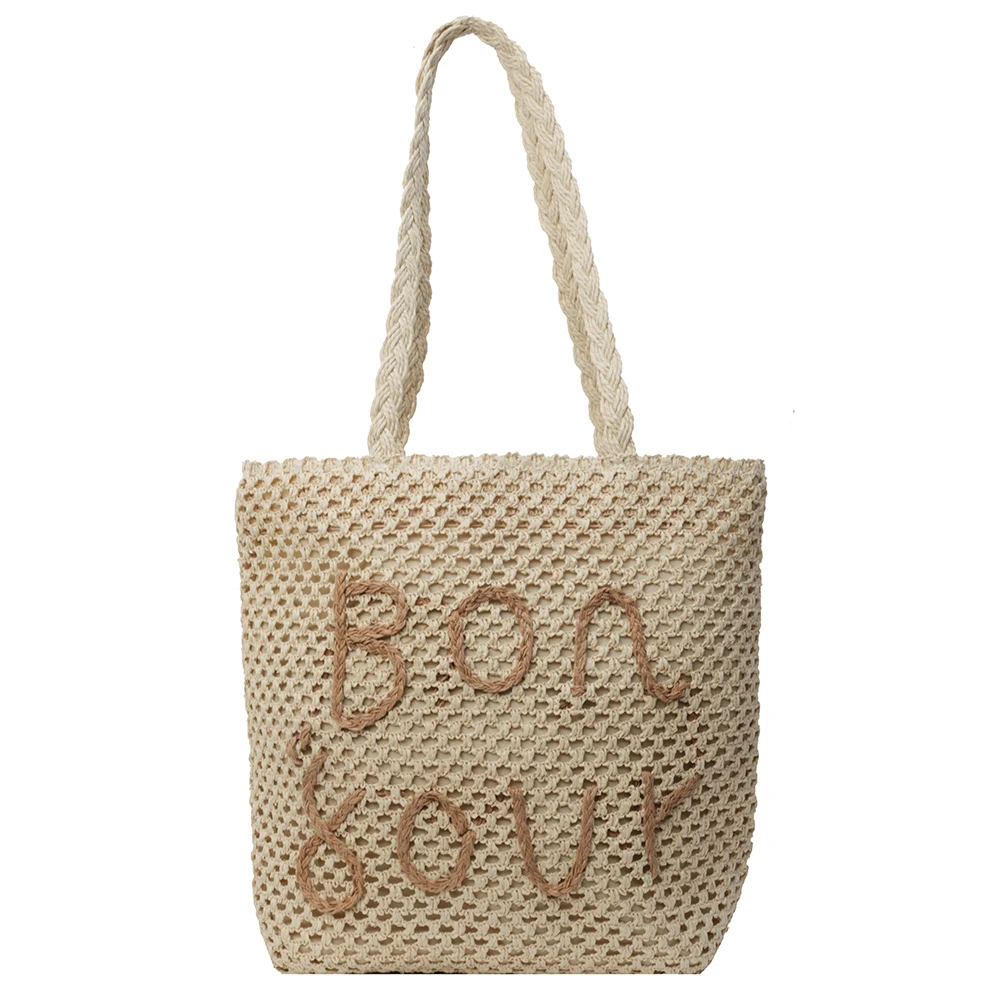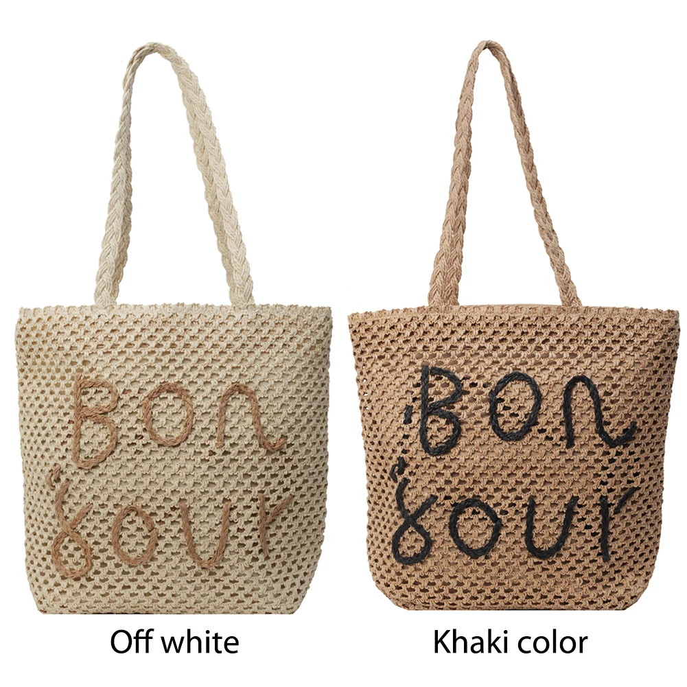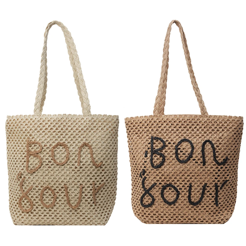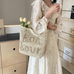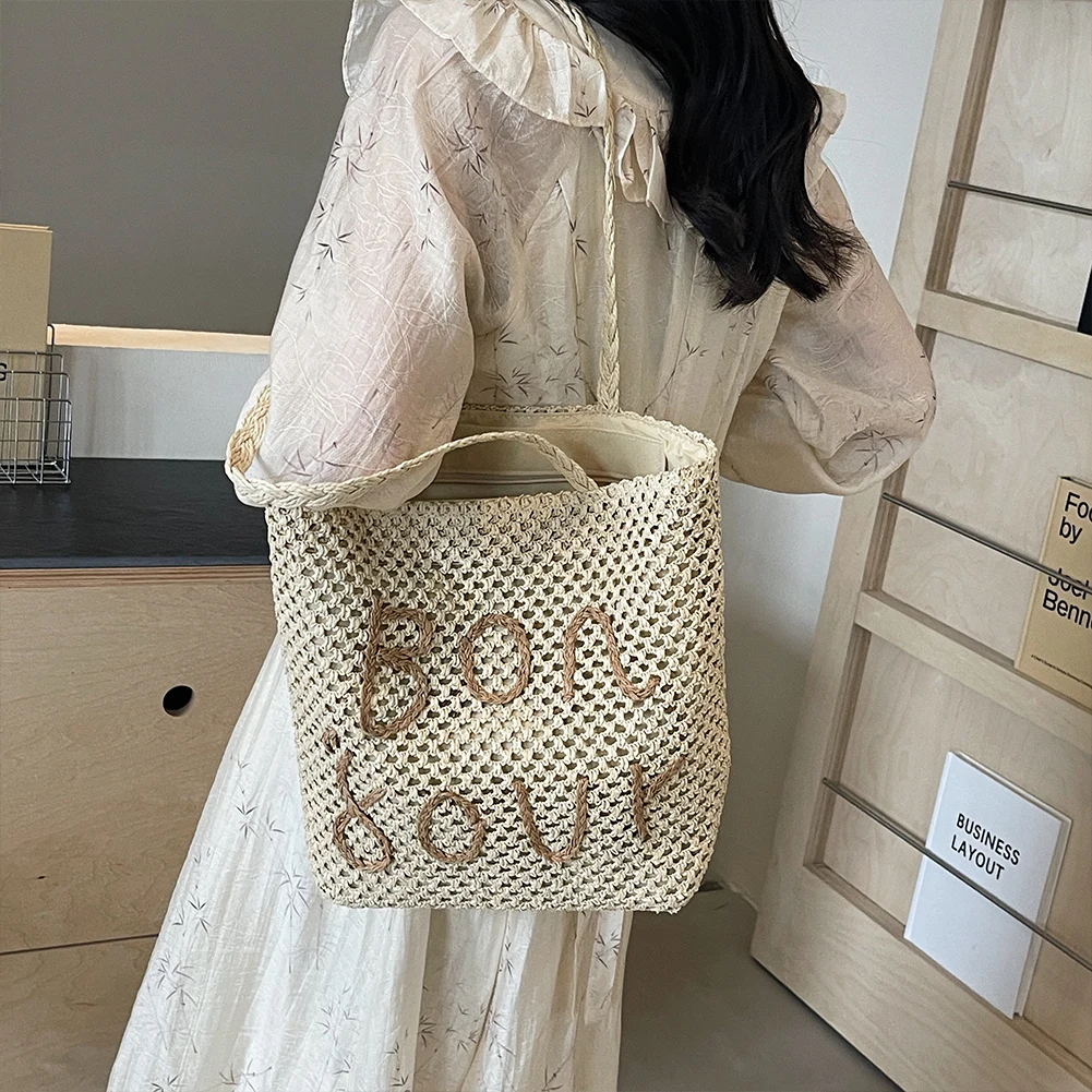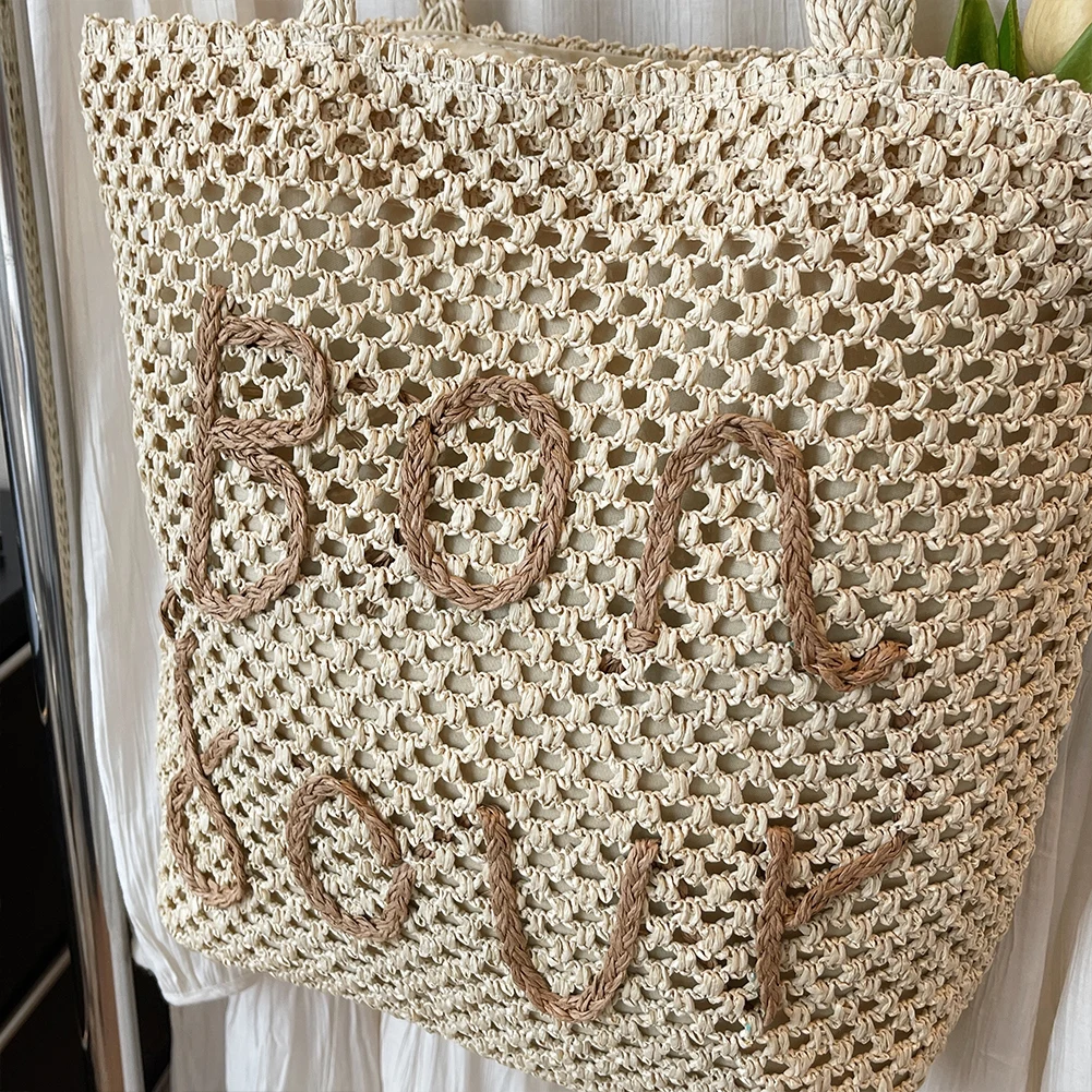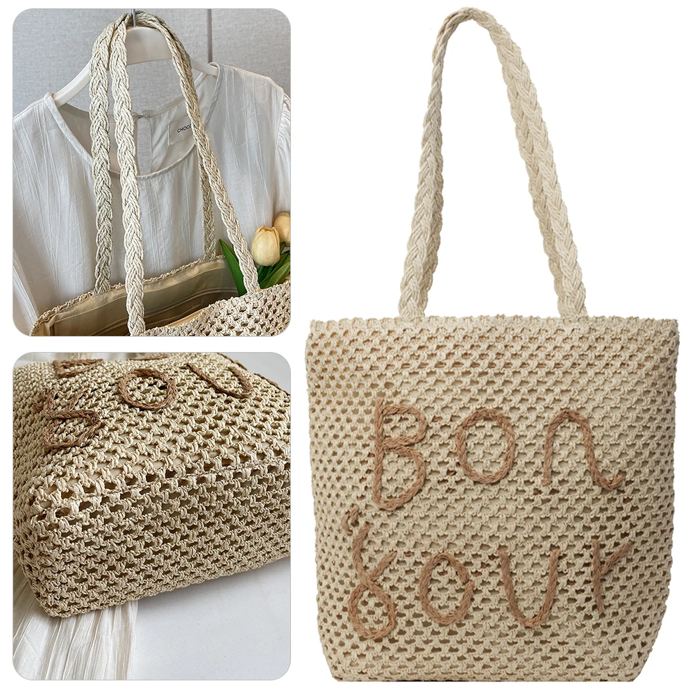 Women Letter Tote Handbag Large Capacity Hollow Out Handbag Versatile Crochet Travel Bag Female Straw Shoulder Bag