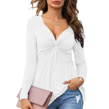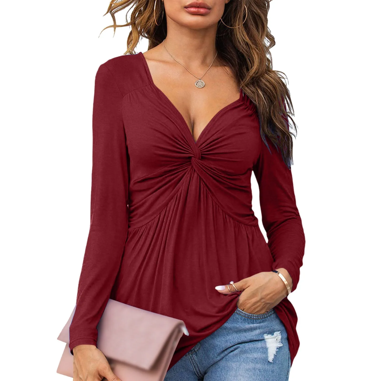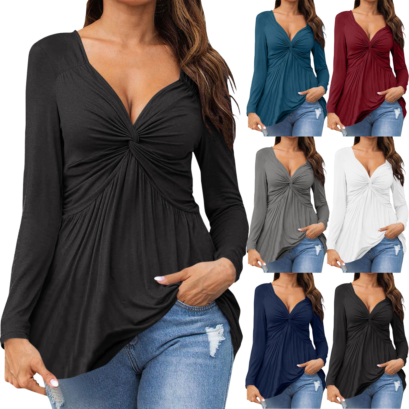 Womens Casual Tops Long Sleeve V Neck Tee Shirt Solid Loose Side Split Blouse Tunic