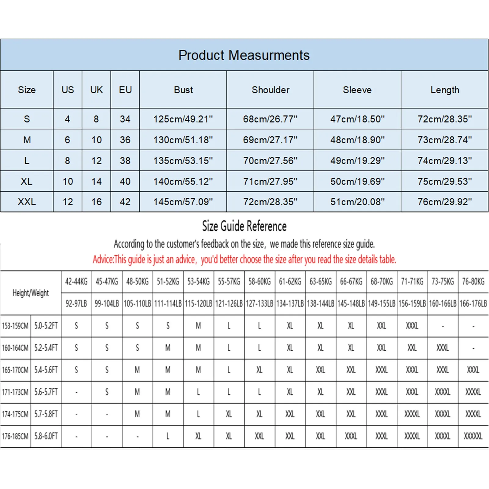| Size:XL | US:10 | UK:14 | EU:40 | Bust:140cm/55.12” | Shoulder:71cm/27.95” | Sleeve:50cm/19.69” | Length:75cm/29.53” |