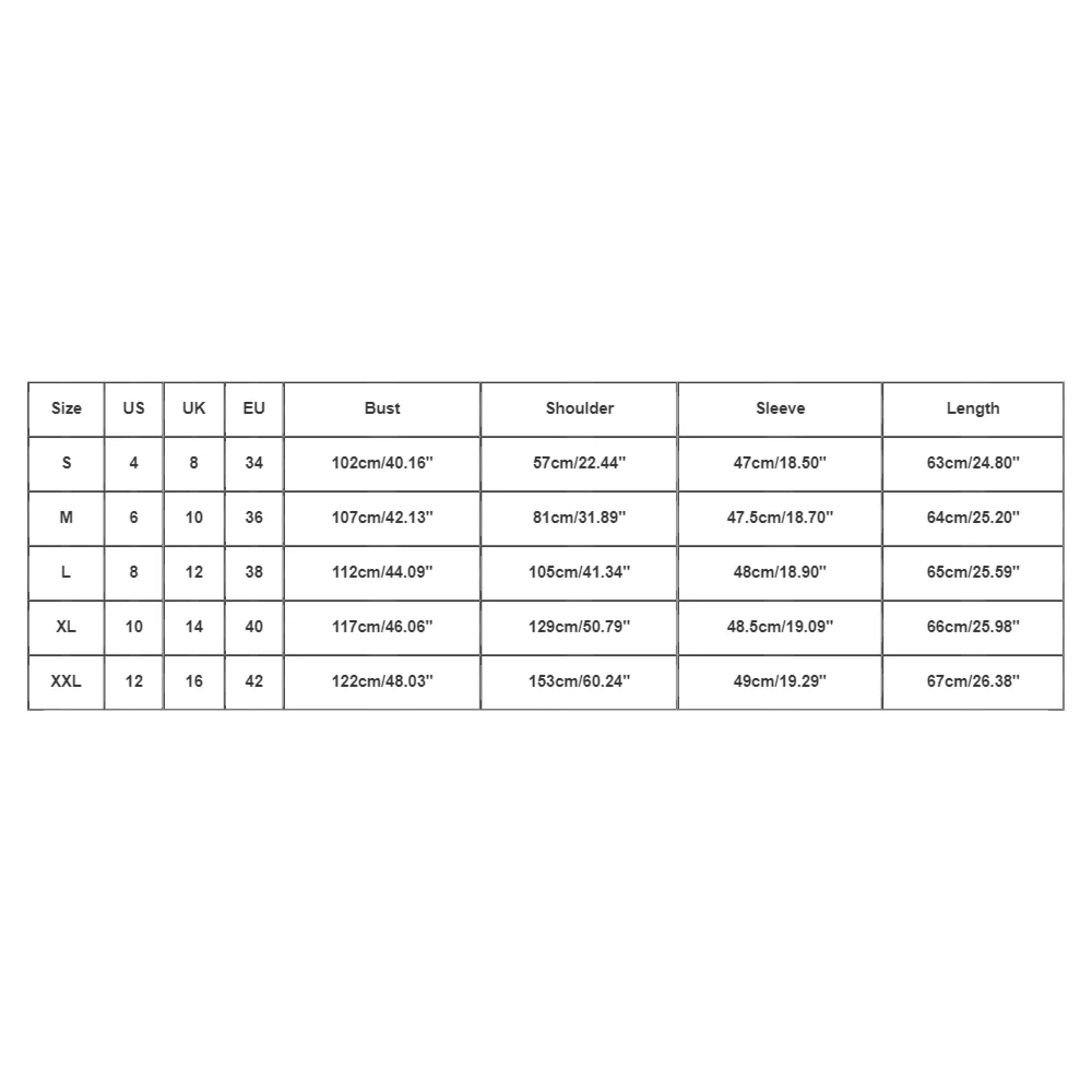| Size:XXL | US:12 | UK:16 | EU:42 | Bust:122cm/48.03” | Shoulder:153cm/60.24” | Sleeve:49cm/19.29” | Length:67cm/26.38” |