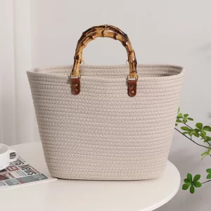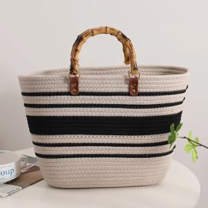 3. Design: Large pocket storage, color matching striped,imitation bamboo handle, easy to carry.Can be used as a handbag to easily match your various styles.