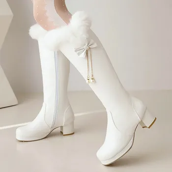 Women'S Thick High Heel Leather Round Head Side Zipper Long Boots.